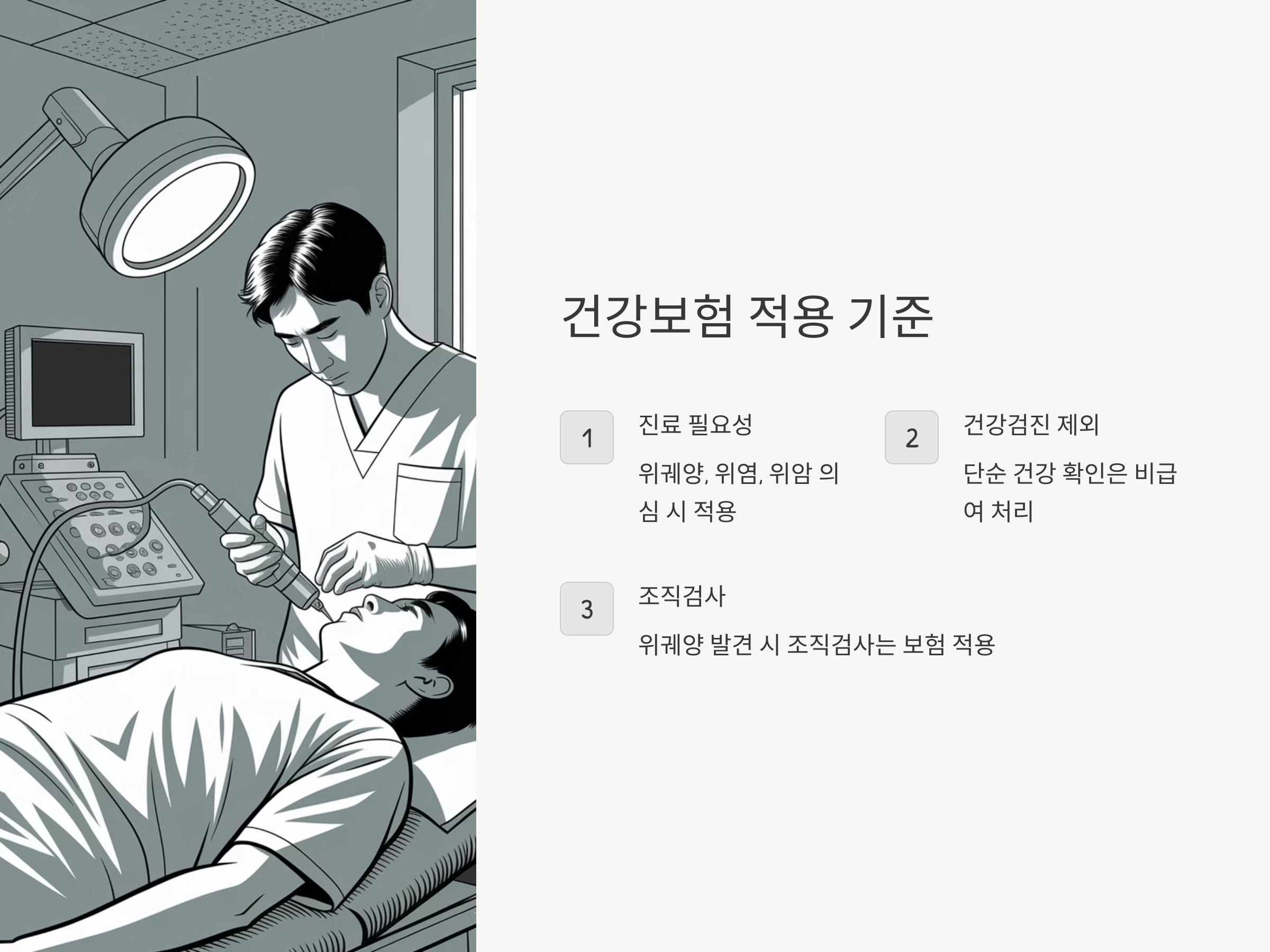 위궤양을 진단하기 위해 시행하는 위내시경 검사는 건강보험 적용이 가능합니다. 그러나 모든 내시경 검사가 보험 혜택을 받는 것은 아닙니다. 건강보험이 적용되는 기준은 다음과 같습니다.