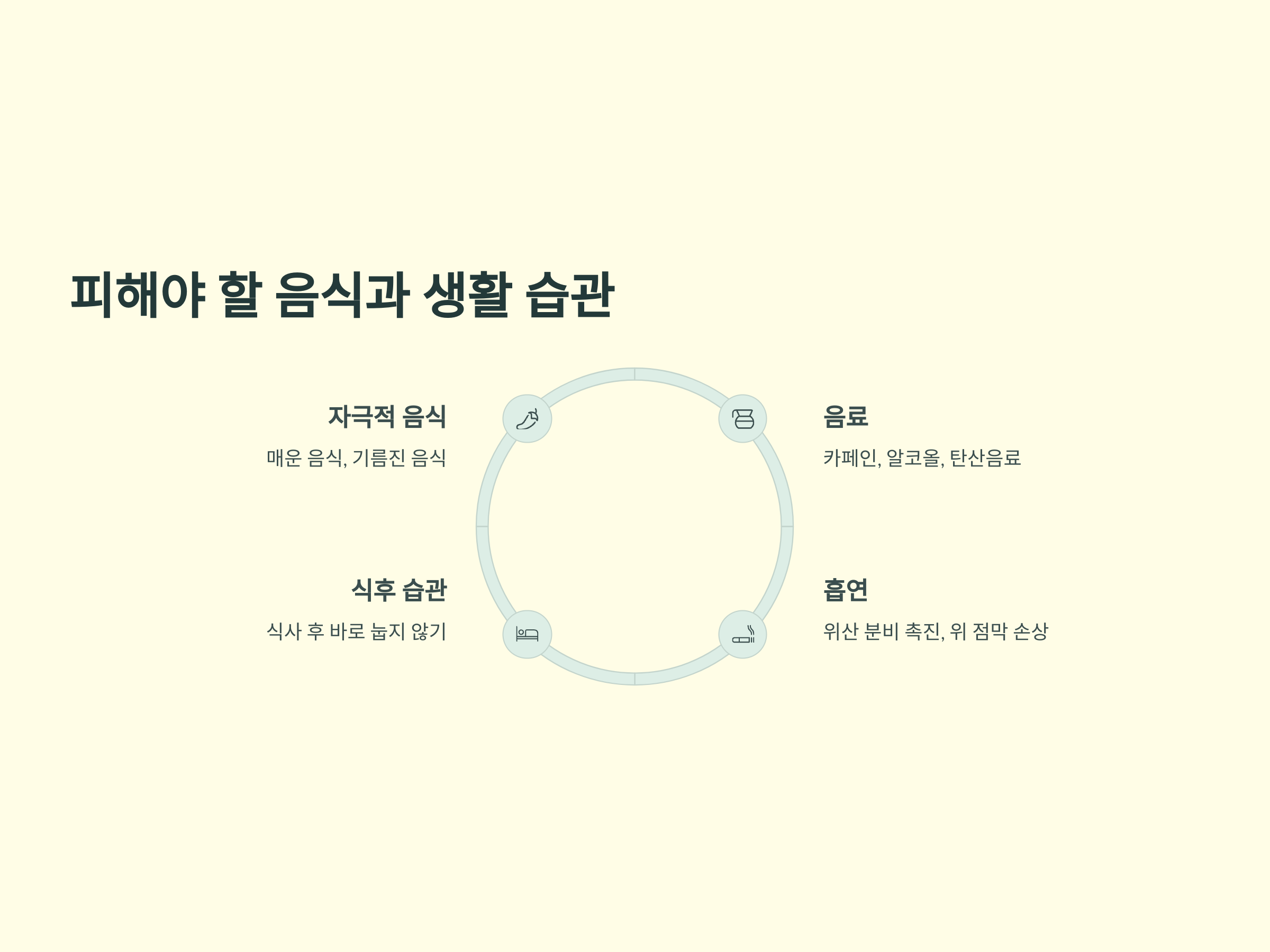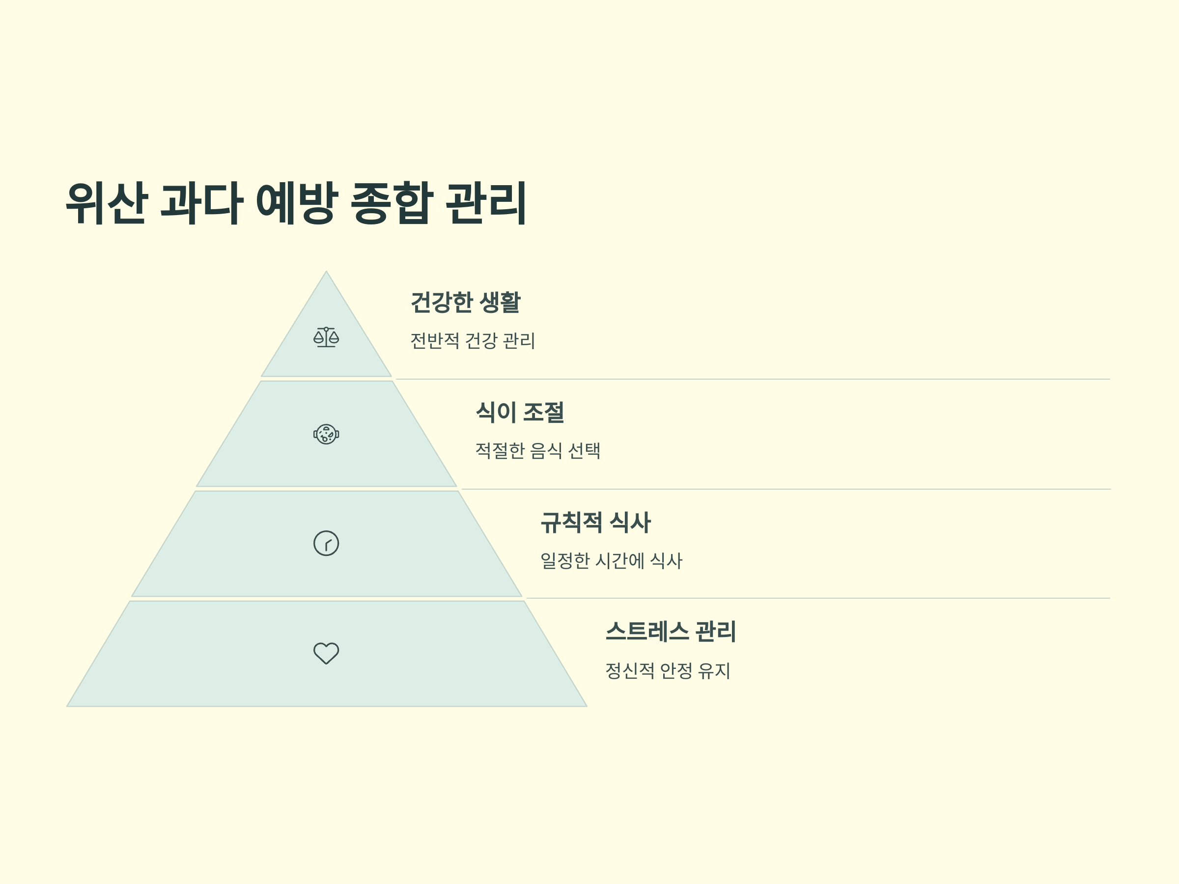 위산 과다를 예방하기 위해서는 특정 음식과 생활 습관을 피하는 것이 중요합니다. 매운 음식, 기름진 음식, 카페인, 알코올, 탄산음료 등은 위산 분비를 촉진하거나 위 점막을 자극하므로 섭취를 제한하는 것이 좋습니다. 또한, 식사 후 바로 눕는 습관은 위산 역류를 유발할 수 있으므로 피해야 합니다.