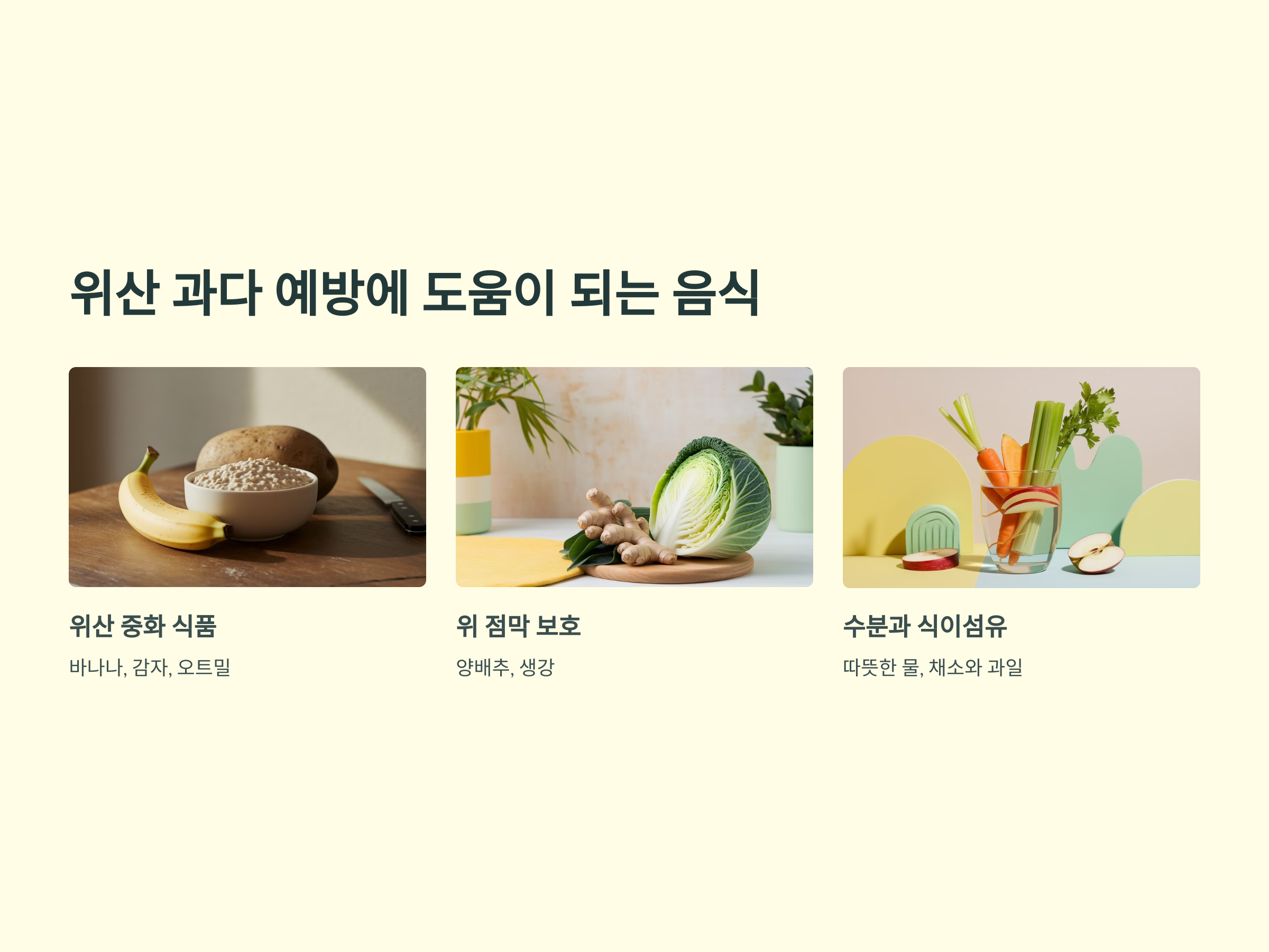 위산 과다를 예방하고 완화하는 데 도움이 되는 음식들을 섭취하는 것도 중요합니다. 바나나, 감자, 양배추, 생강, 오트밀 등은 위산을 중화하거나 위 점막을 보호하는 효과가 있습니다. 이러한 음식을 꾸준히 섭취함으로써 위 건강을 유지할 수 있습니다.
