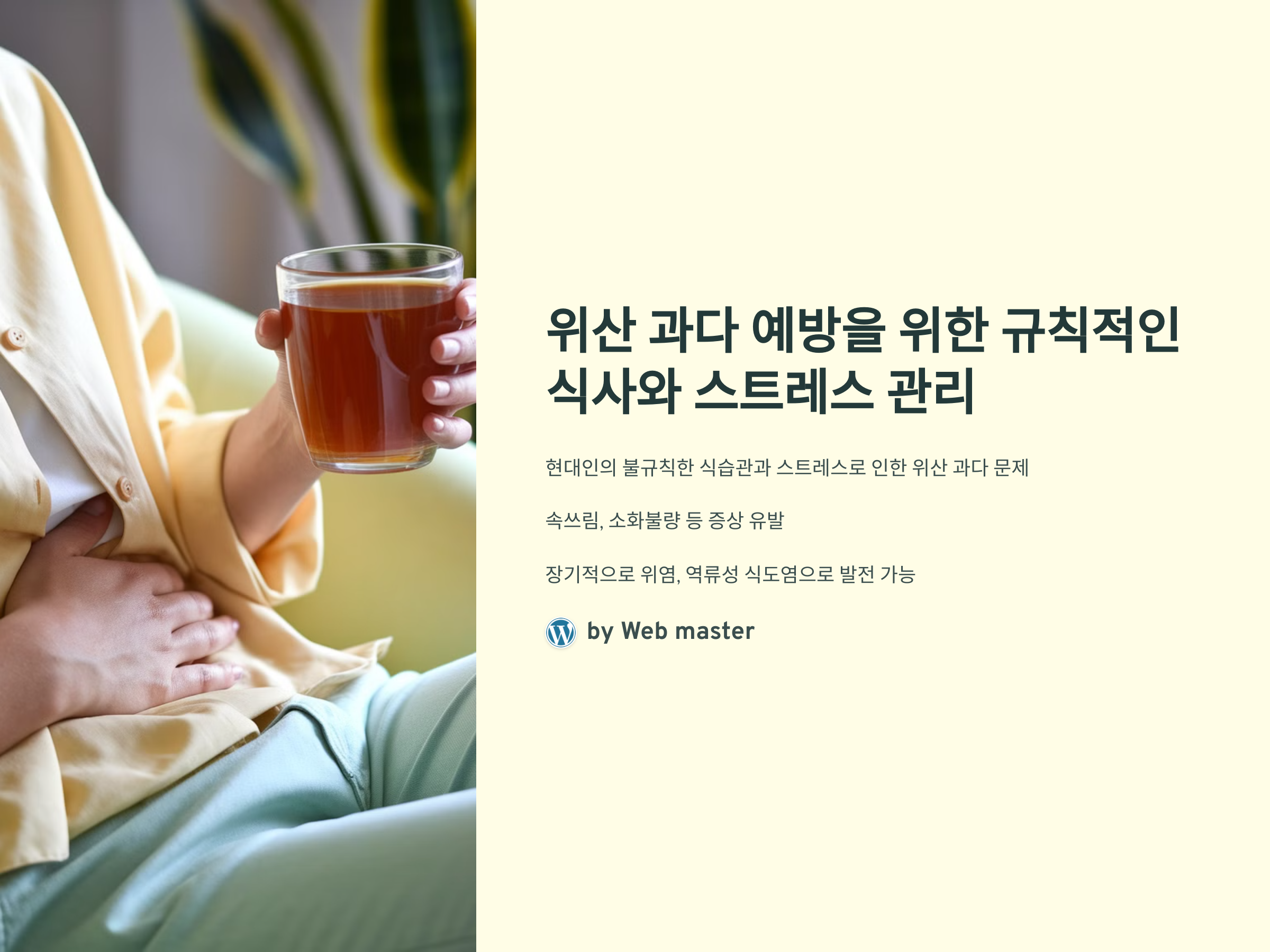위산 과다는 현대인의 불규칙한 식습관과 스트레스 등으로 인해 흔히 발생하는 문제입니다. 이는 속쓰림, 소화불량 등 다양한 소화기 증상을 유발하며, 장기적으로는 위염이나 역류성 식도염과 같은 질환으로 발전할 수 있습니다. 이러한 위산 과다를 예방하기 위해서는 규칙적인 식사와 효과적인 스트레스 관리가 필수적입니다. 이번 글에서는 위산 과다의 원인과 증상, 그리고 이를 예방하기 위한 구체적인 방법들을 알아보겠습니다.