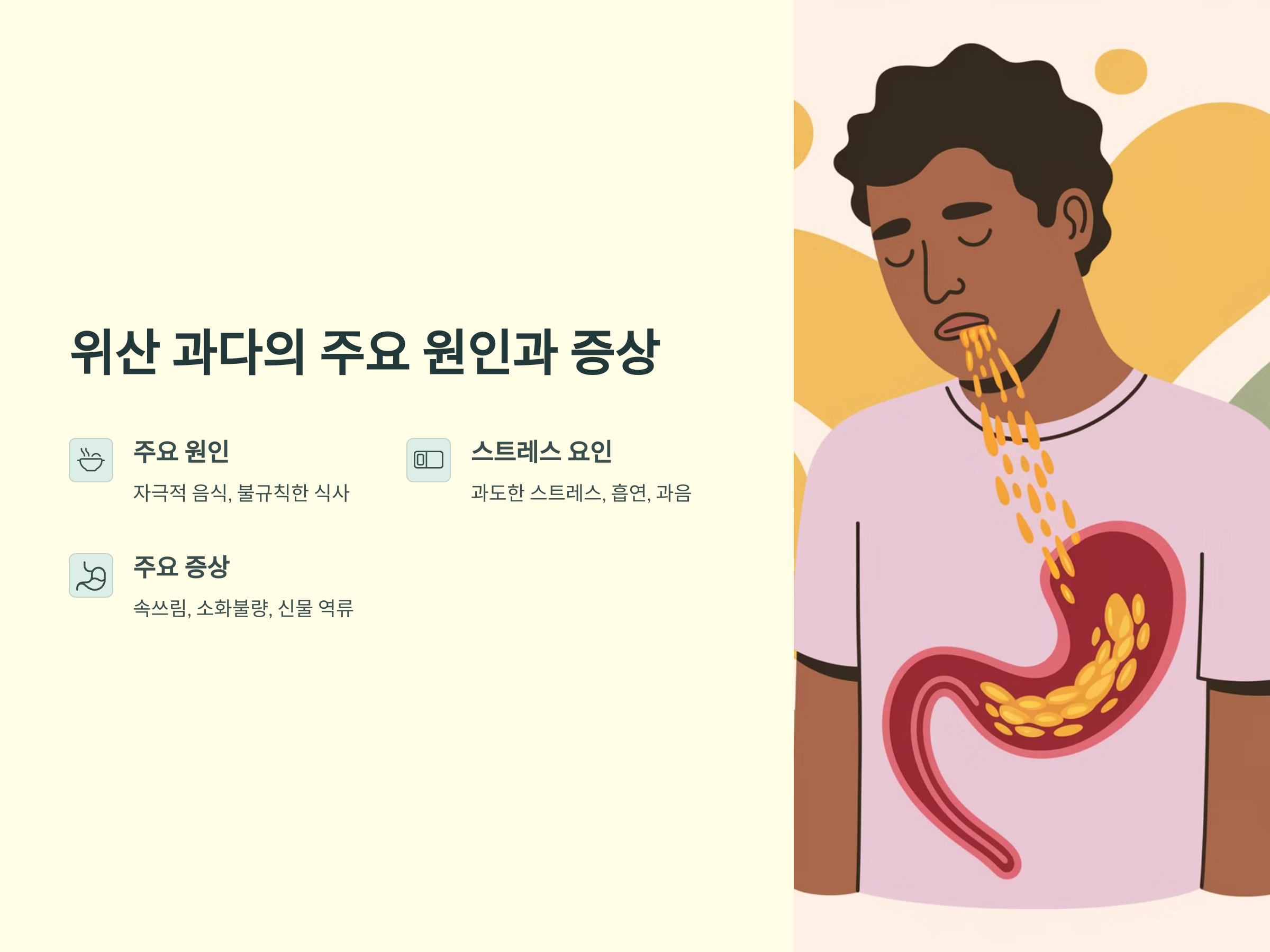 위산 과다는 다양한 요인에 의해 발생할 수 있습니다. 대표적인 원인으로는 자극적인 음식 섭취, 불규칙한 식사 습관, 과도한 스트레스, 흡연과 과음 등이 있습니다. 이러한 요인들은 위산 분비를 촉진하거나 위 점막을 손상시켜 위산 과다를 유발할 수 있습니다.