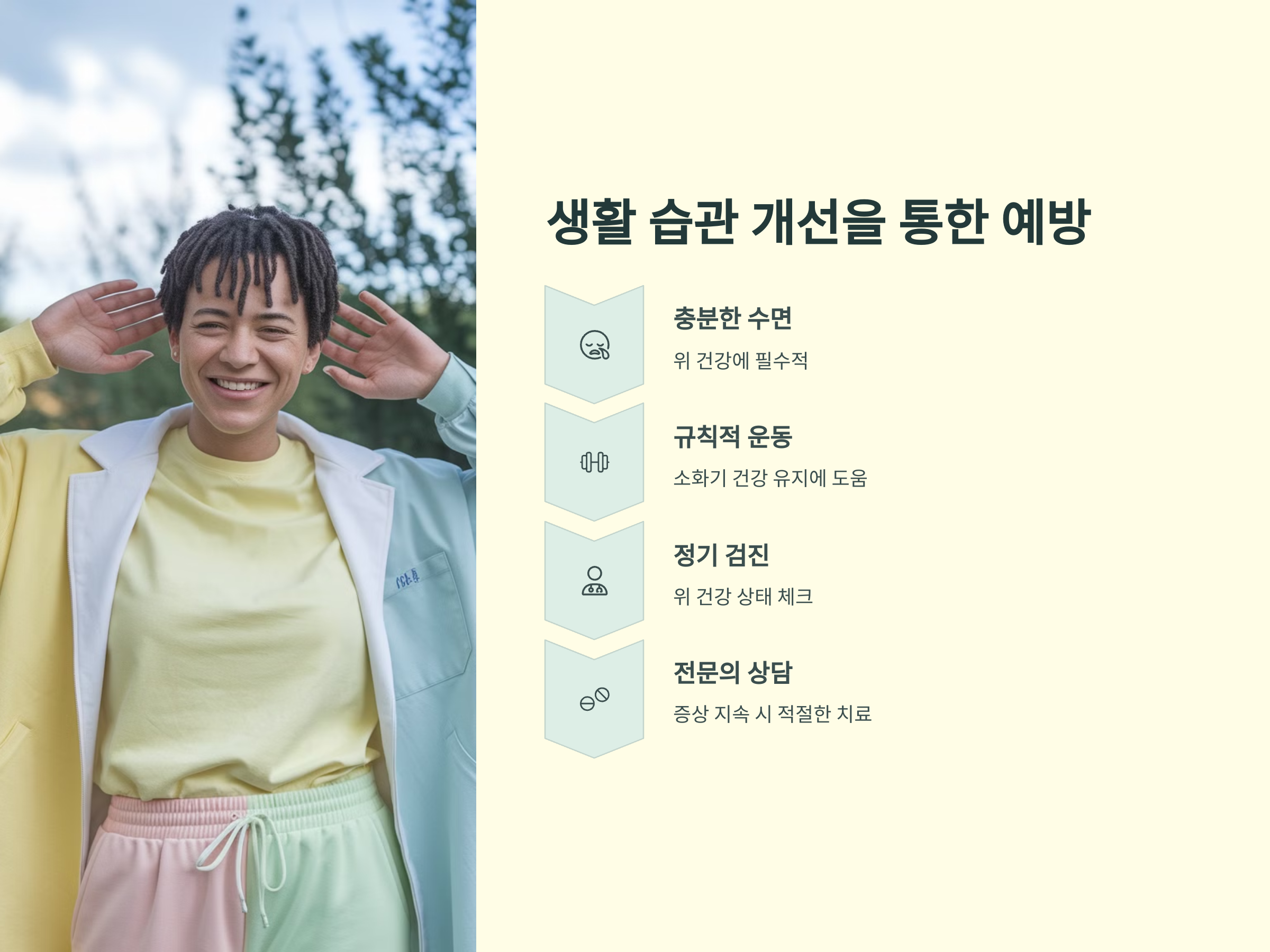 위산 과다를 예방하기 위해서는 전반적인 생활 습관을 개선하는 것이 중요합니다. 규칙적인 식사와 스트레스 관리 외에도, 충분한 수면을 취하고 규칙적인 운동을 하는 것이 도움이 됩니다. 이러한 생활 습관의 변화는 위산 과다를 예방하고 전반적인 소화기 건강을 유지하는 데 큰 역할을 합니다.