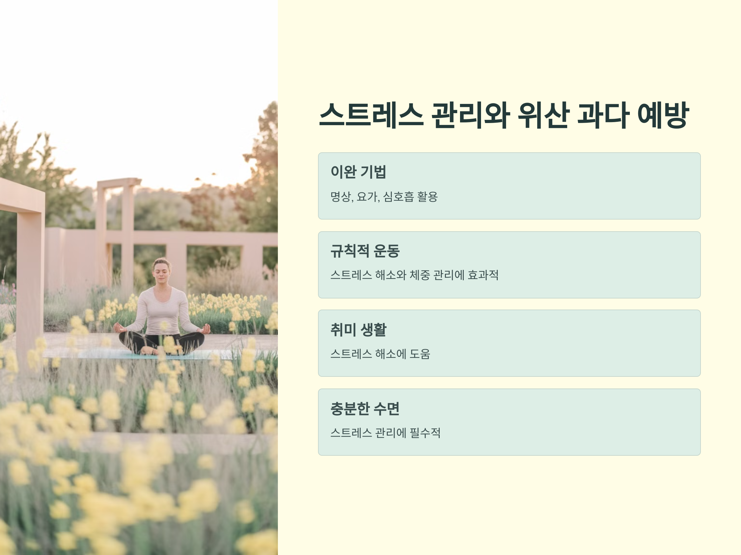 스트레스 관리를 위해서는 명상, 요가, 심호흡 등의 이완 기법을 활용하는 것이 도움이 됩니다. 또한, 규칙적인 운동은 스트레스 해소와 체중 관리에 효과적이며, 이는 위산 과다 예방에 긍정적인 영향을 미칩니다. 취미 생활이나 충분한 수면을 통해 스트레스를 해소하는 것도 중요합니다.