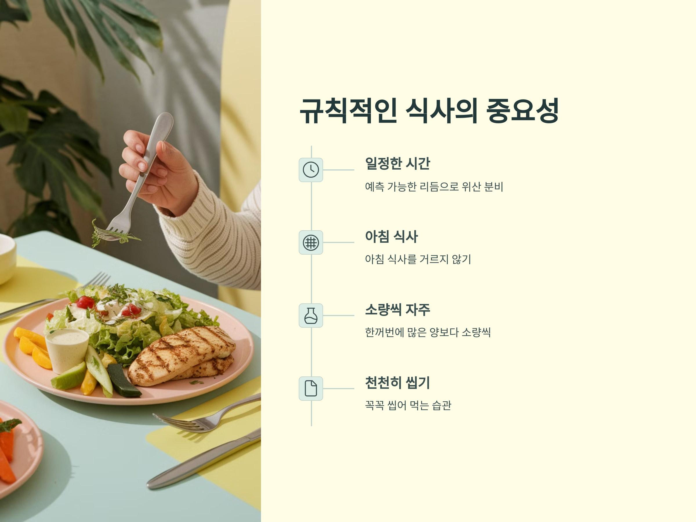 규칙적인 식사는 위산 과다를 예방하는 데 중요한 역할을 합니다. 일정한 시간에 식사를 하면 위는 예측 가능한 리듬으로 위산을 분비하게 되어 과도한 위산 분비를 방지할 수 있습니다. 특히 아침 식사를 거르지 않는 것이 중요하며, 하루 세 끼를 일정한 시간에 섭취하는 것이 바람직합니다.
