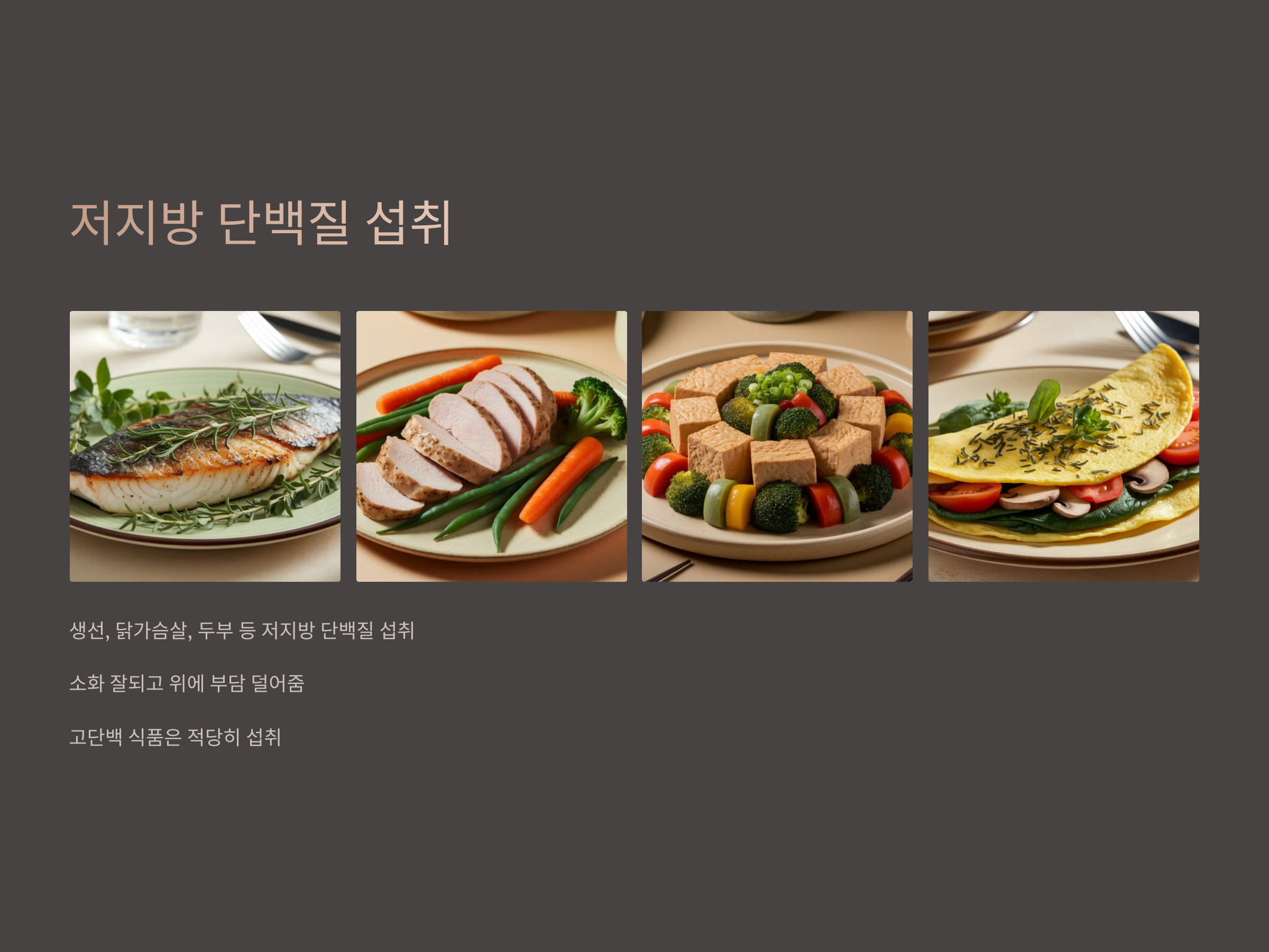 위산 과다 환자에게는 저지방 단백질이 좋은 선택이 될 수 있습니다. 생선, 닭가슴살, 두부 등은 소화가 잘되며, 위에 부담을 덜어줄 수 있습니다. 고단백 식품은 소화가 어려워 위산 과다를 유발할 수 있으므로, 적당히 섭취하는 것이 중요합니다.