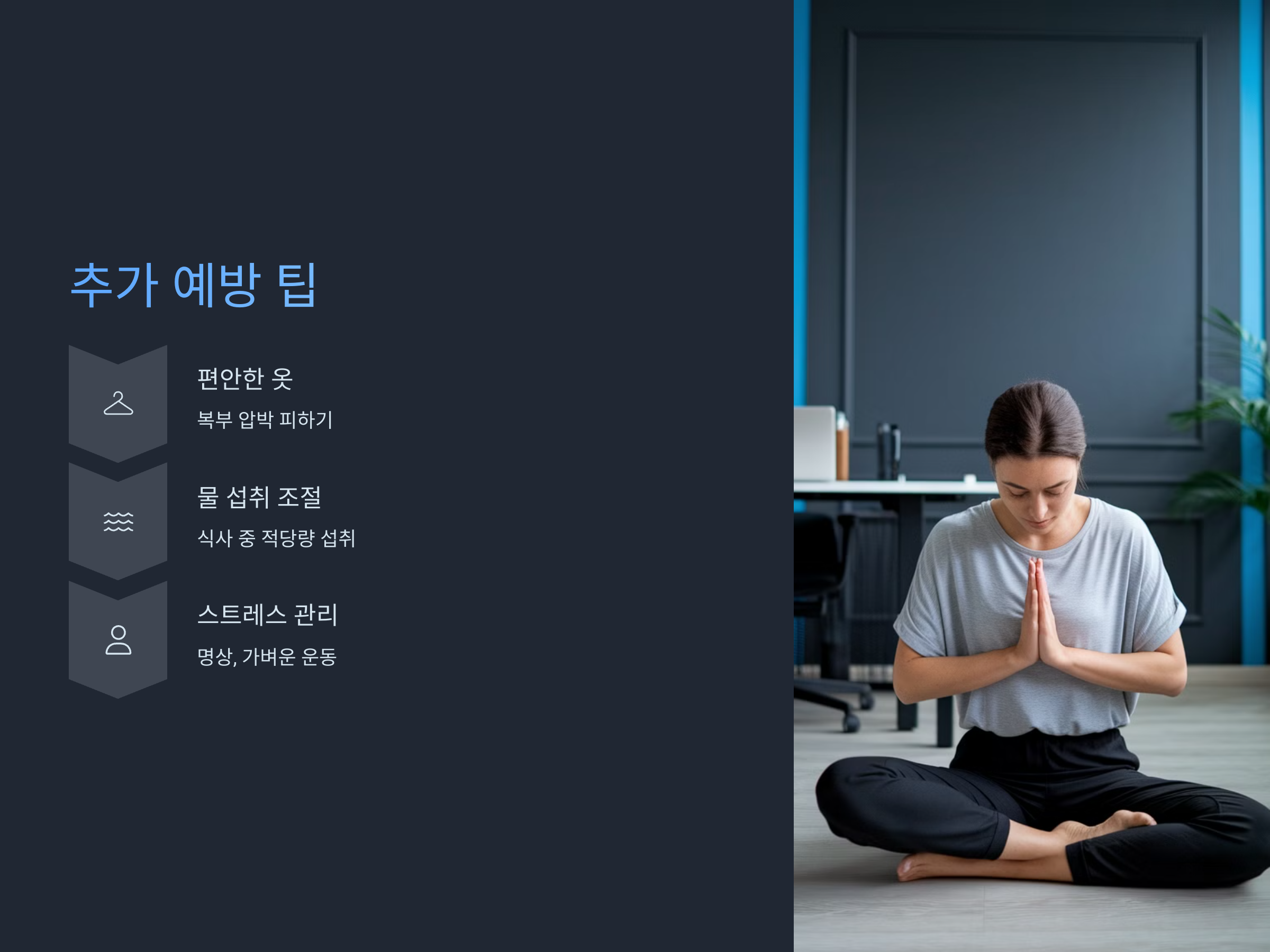- 식사 조절: 과식을 피하고, 특히 취침 전 2~3시간 이내에는 식사를 삼가야 합니다.