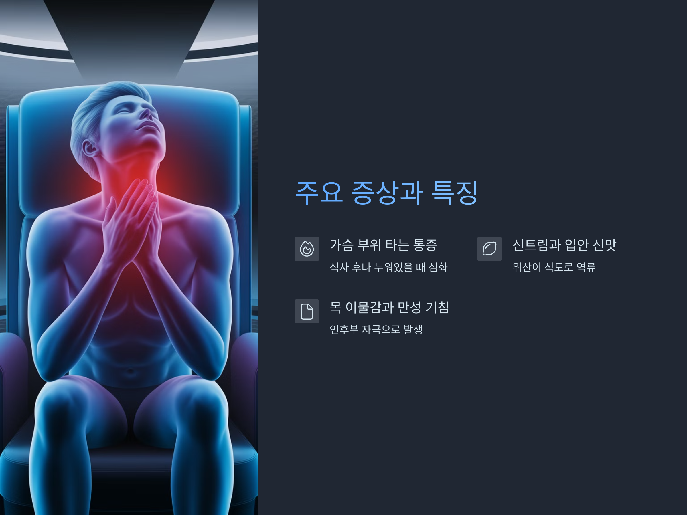 - 목 이물감과 만성 기침: 위산이 인후부를 자극하여 목에 이물감이 느껴지거나 이유 없는 기침이 지속될 수 있습니다.