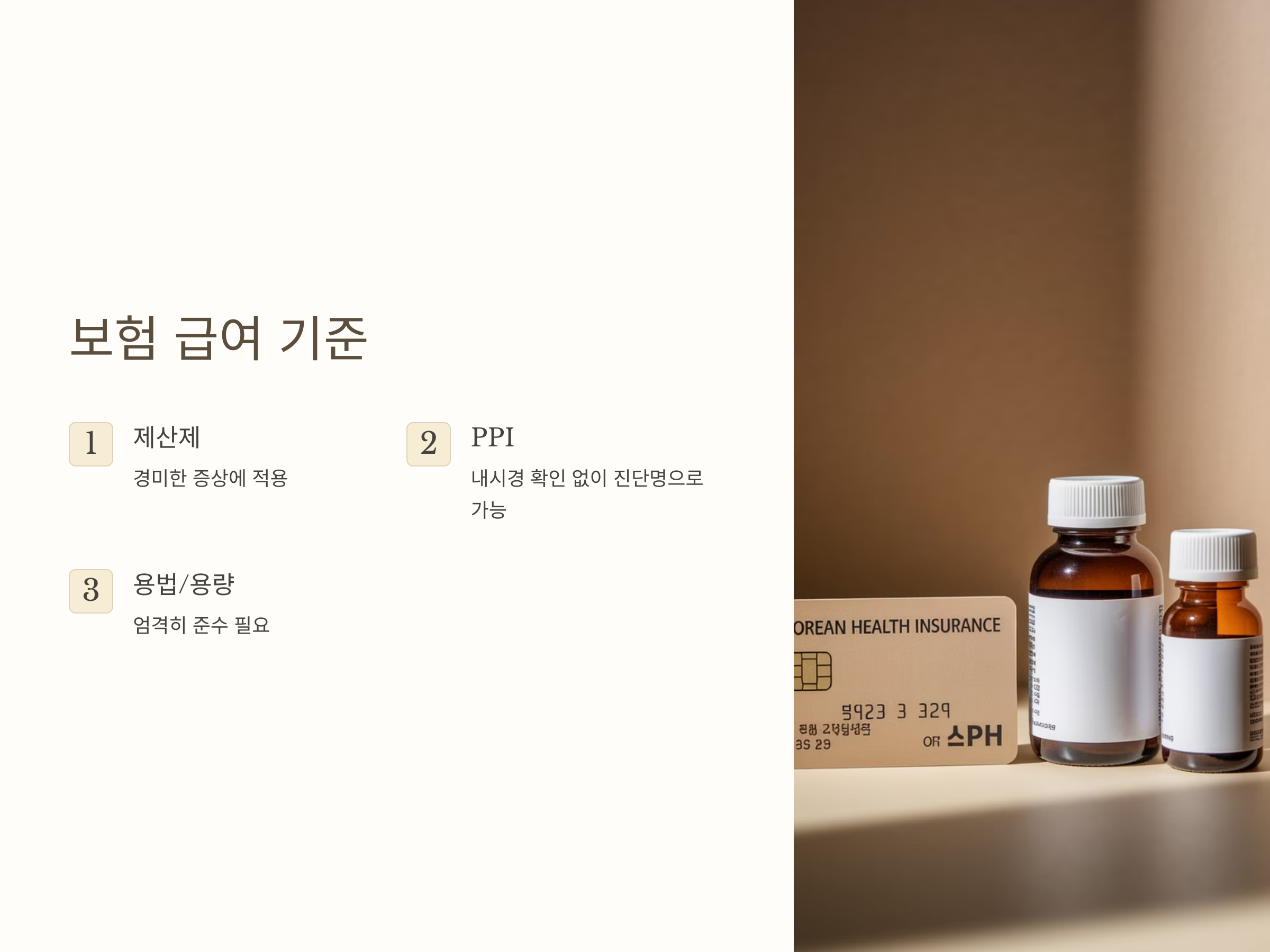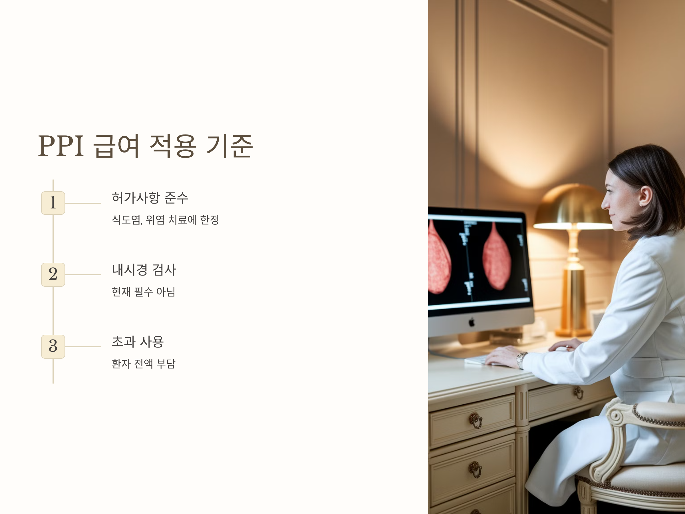 PPI는 과거 내시경 검사 결과가 반드시 필요했으나, 2008년부터 내시경 확인 없이도 진단명만으로 보험 급여가 가능해졌습니다【12†source】. PPI의 급여 기준은 내시경을 통해 확인된 식도염, 궤양 등 명확한 진단에 따른 처방에 한해 적용됩니다. 특히, PPI는 효능ㆍ효과에 대한 전산 심사 기준에 맞춰 처방되어야 하며, 용법과 용량을 엄격히 지켜야 합니다【12†source】.