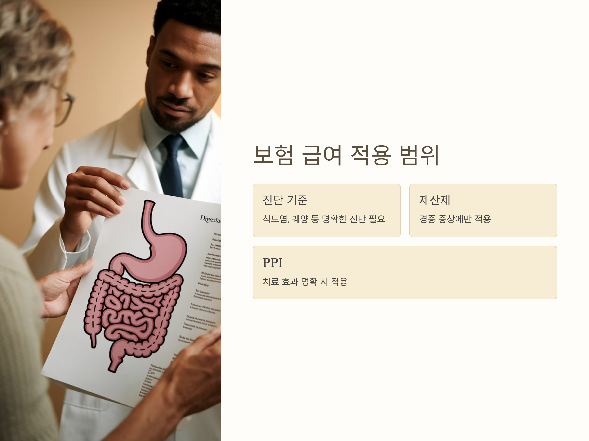 위식도 역류 질환에 대한 제산제와 PPI의 보험 급여 적용 범위는 매우 구체적입니다. 보험 급여가 적용되는 약물은 기본적으로 식도염이나 궤양과 같은 진단을 받은 환자에게만 해당되며, 그 외의 경우에는 보험 급여가 적용되지 않습니다. 또한, 제산제의 경우, 경증 증상에만 급여가 적용되며, PPI는 치료 효과가 명확한 경우에만 급여가 적용됩니다【8†source】【11†source】.