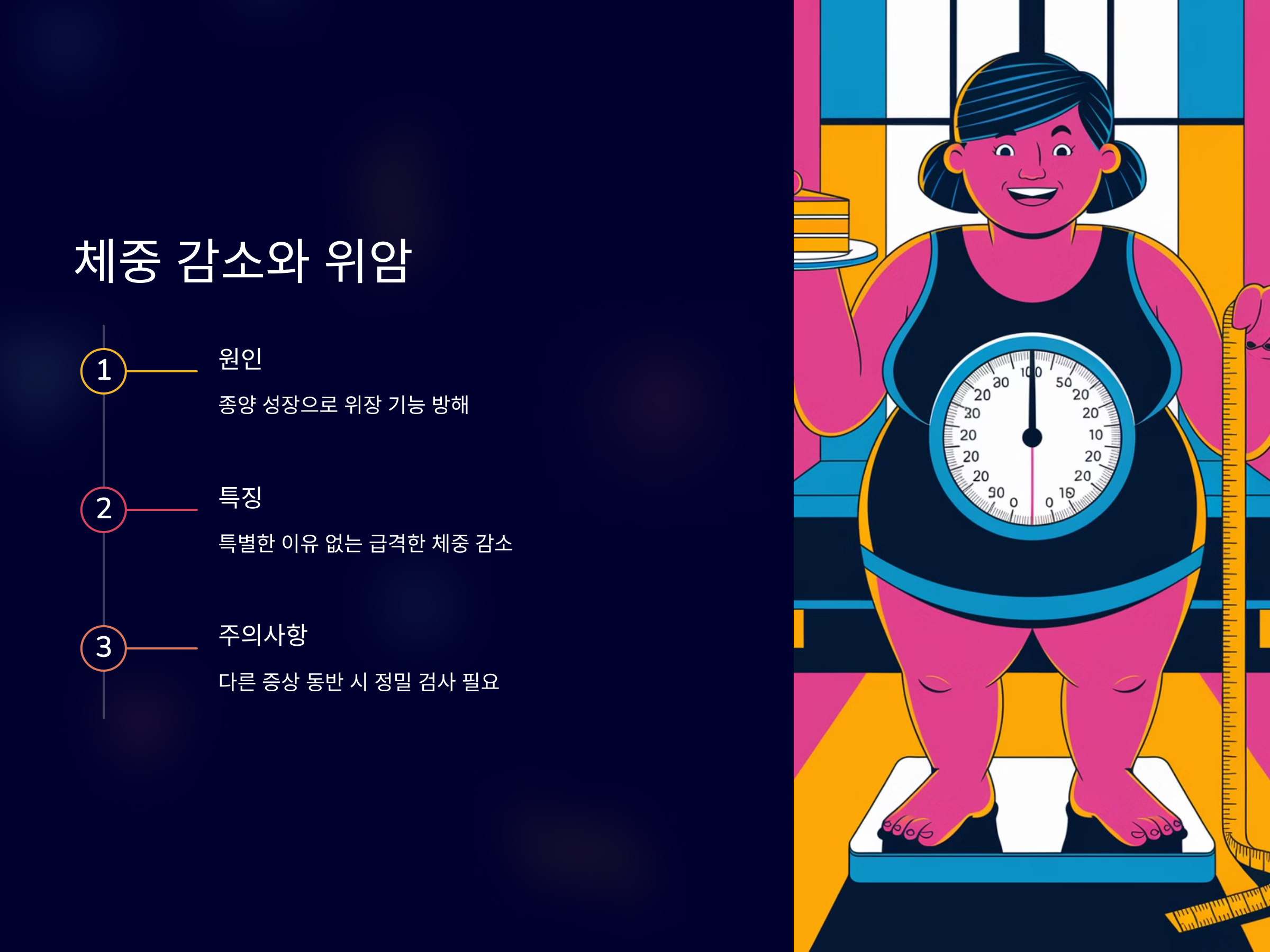 그러나 만약 이러한 증상이 2주 이상 지속되고, 체중 감소와 함께 다른 증상들이 동반된다면, 위암을 비롯한 소화기 질환의 가능성을 고려해 봐야 합니다. 건강한 식습관과 규칙적인 운동을 통해 소화기 건강을 관리하는 것이 중요합니다.