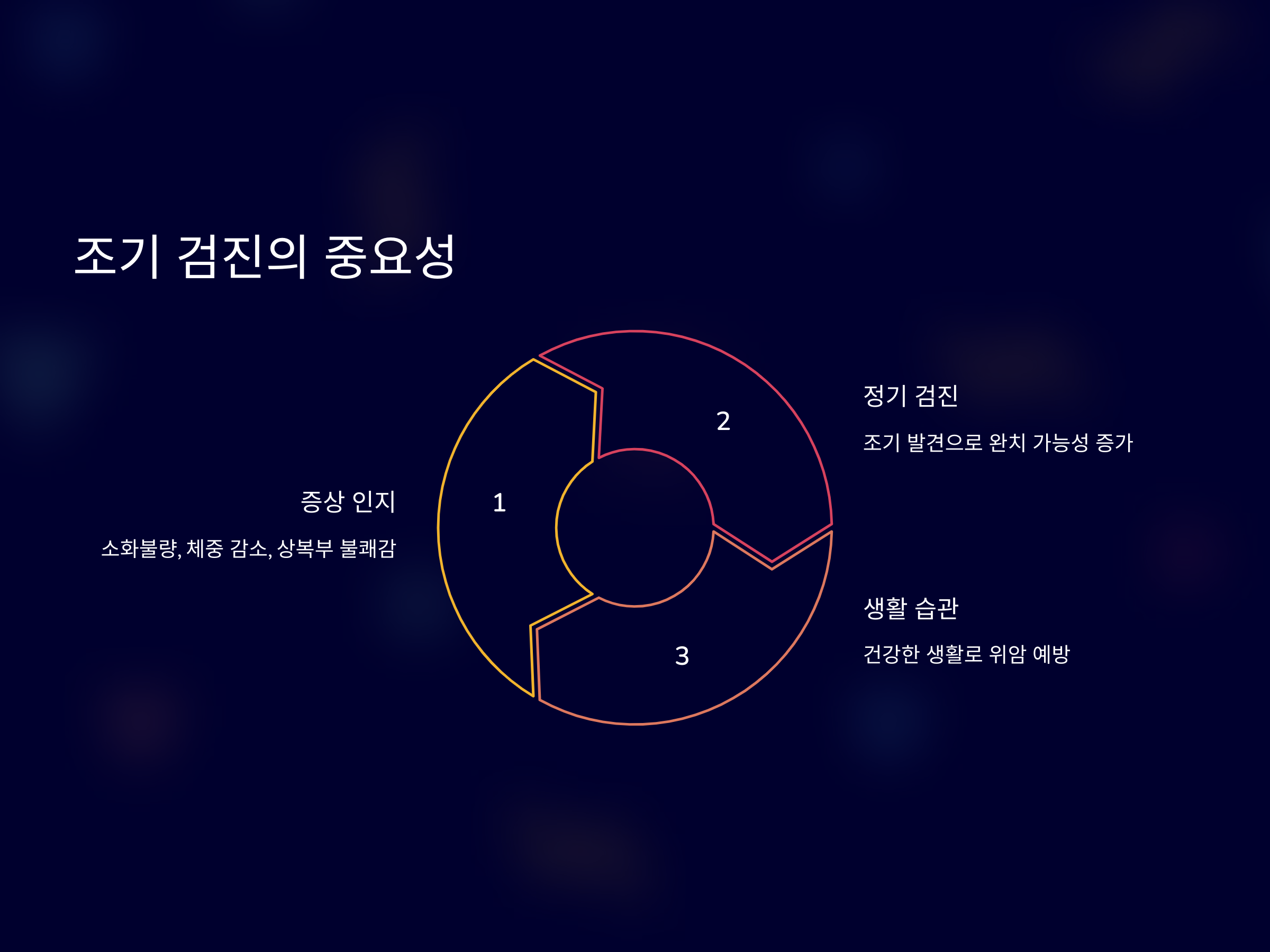 위암의 전조증상을 미리 인지하고 조기에 검진을 받는 것은 매우 중요합니다. 위암은 초기 단계에서 증상이 거의 나타나지 않기 때문에, 만약 소화불량, 체중 감소, 상복부 불쾌감 등의 증상이 지속되면 반드시 검사를 통해 원인을 확인해야 합니다.