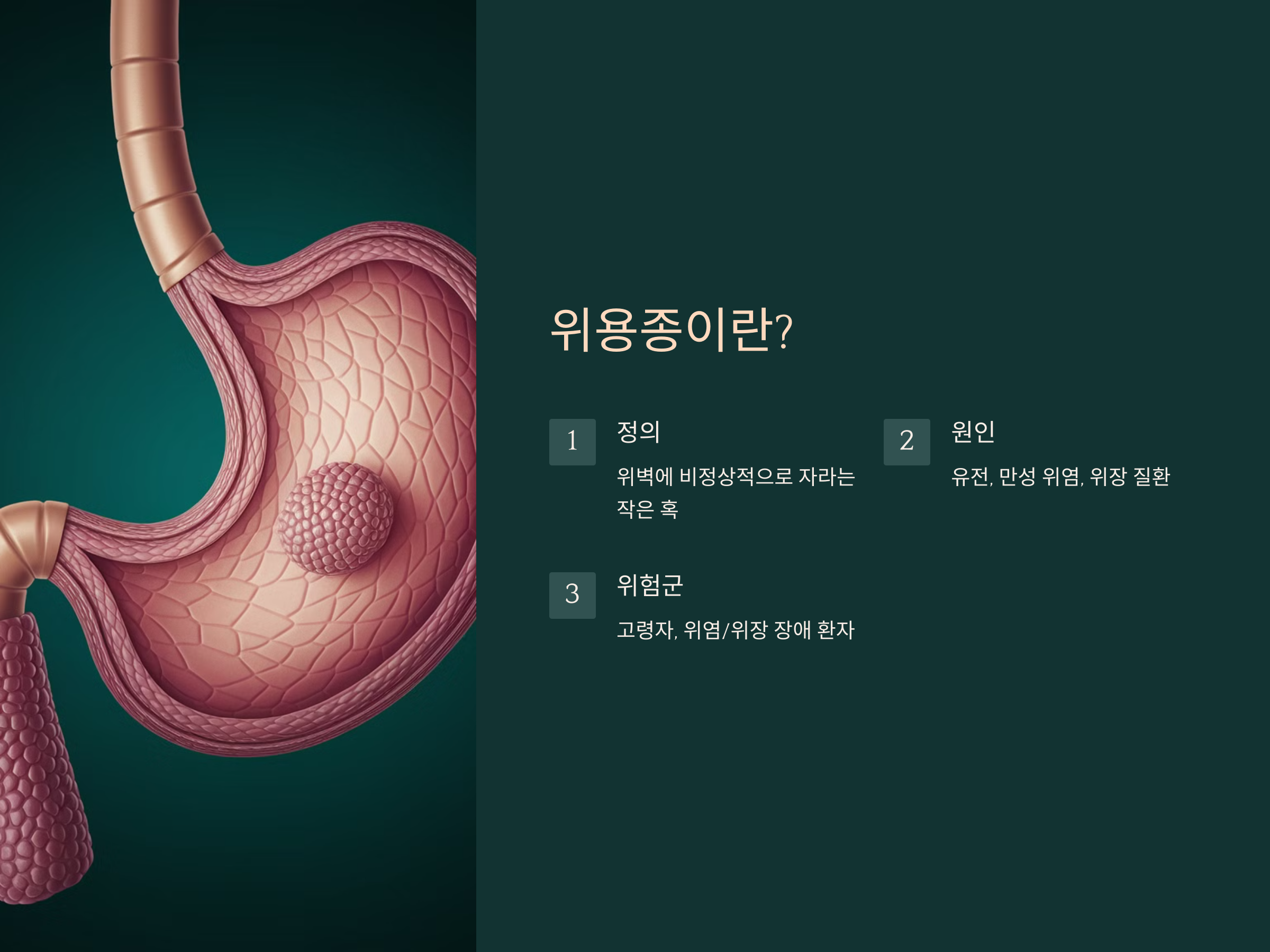 위용종은 위벽에 비정상적으로 자라나는 작은 혹(폴립)입니다. 대부분의 위용종은 양성이지만, 드물게 악성으로 변할 수 있으므로 주의가 필요합니다. 위용종이 발생하는 주요 원인으로는 유전적인 요인, 만성 위염, 위장 질환 등이 있습니다. 또한, 나이가 많고 위염이나 위장 장애를 앓고 있는 사람들이 위용종에 걸릴 위험이 더 높습니다.