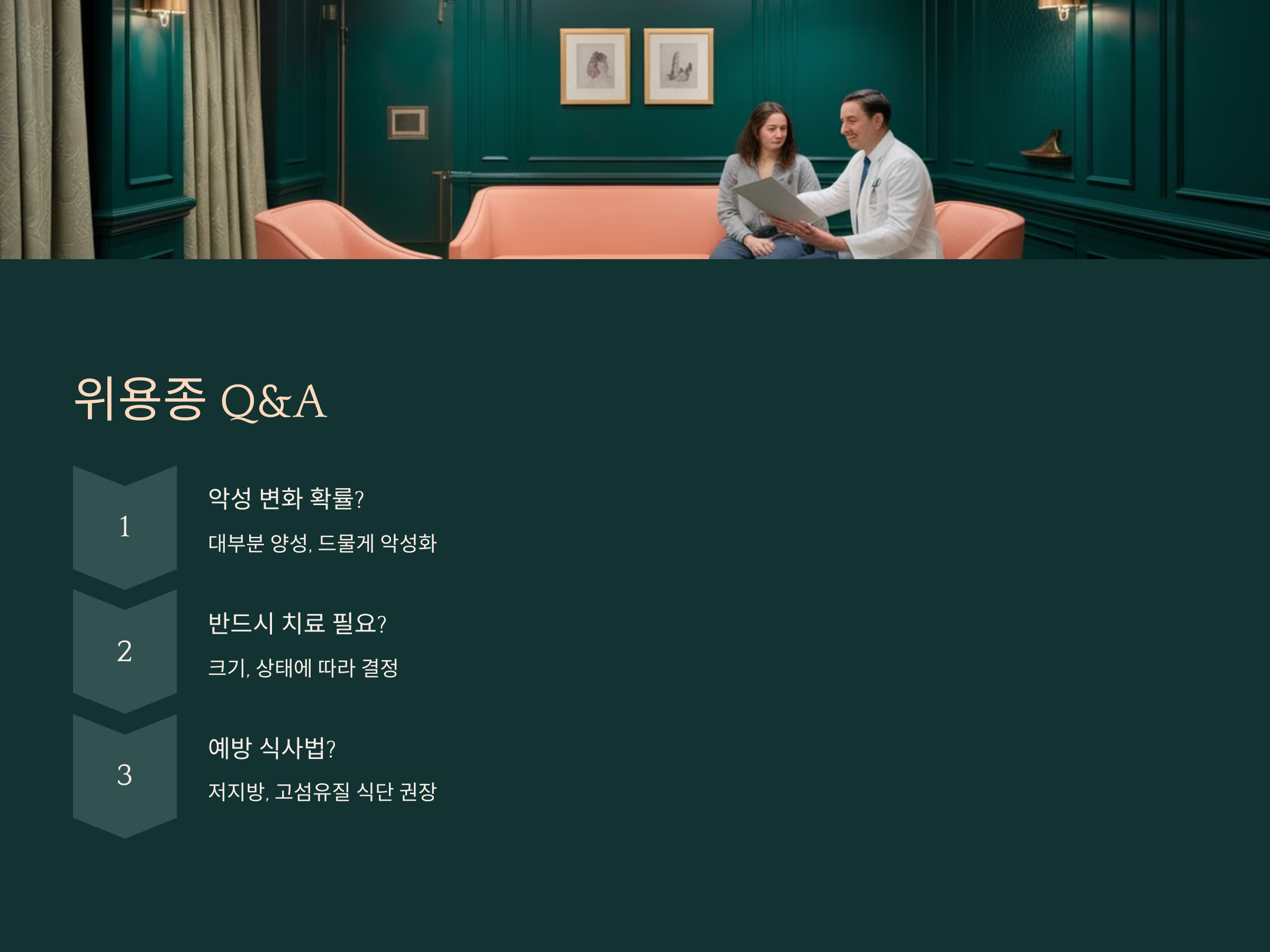 위용종은 대부분 양성이지만, 드물게 악성으로 변할 수 있습니다. 따라서 발견 시 정기적인 검진과 조치가 필요합니다.