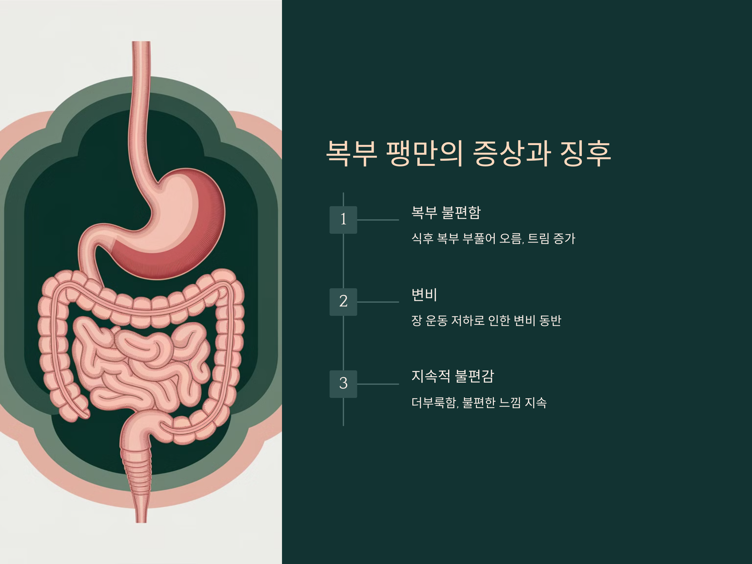복부 팽만은 주로 소화되지 않은 음식물이 장에 고여있을 때 발생합니다. 복부가 부풀어 오르며, 더부룩하고 불편한 느낌을 자주 경험하게 됩니다. 지속적인 복부 팽만은 위장 운동 저하의 전형적인 증상으로, 여러 가지 원인으로 인해 발생할 수 있습니다.