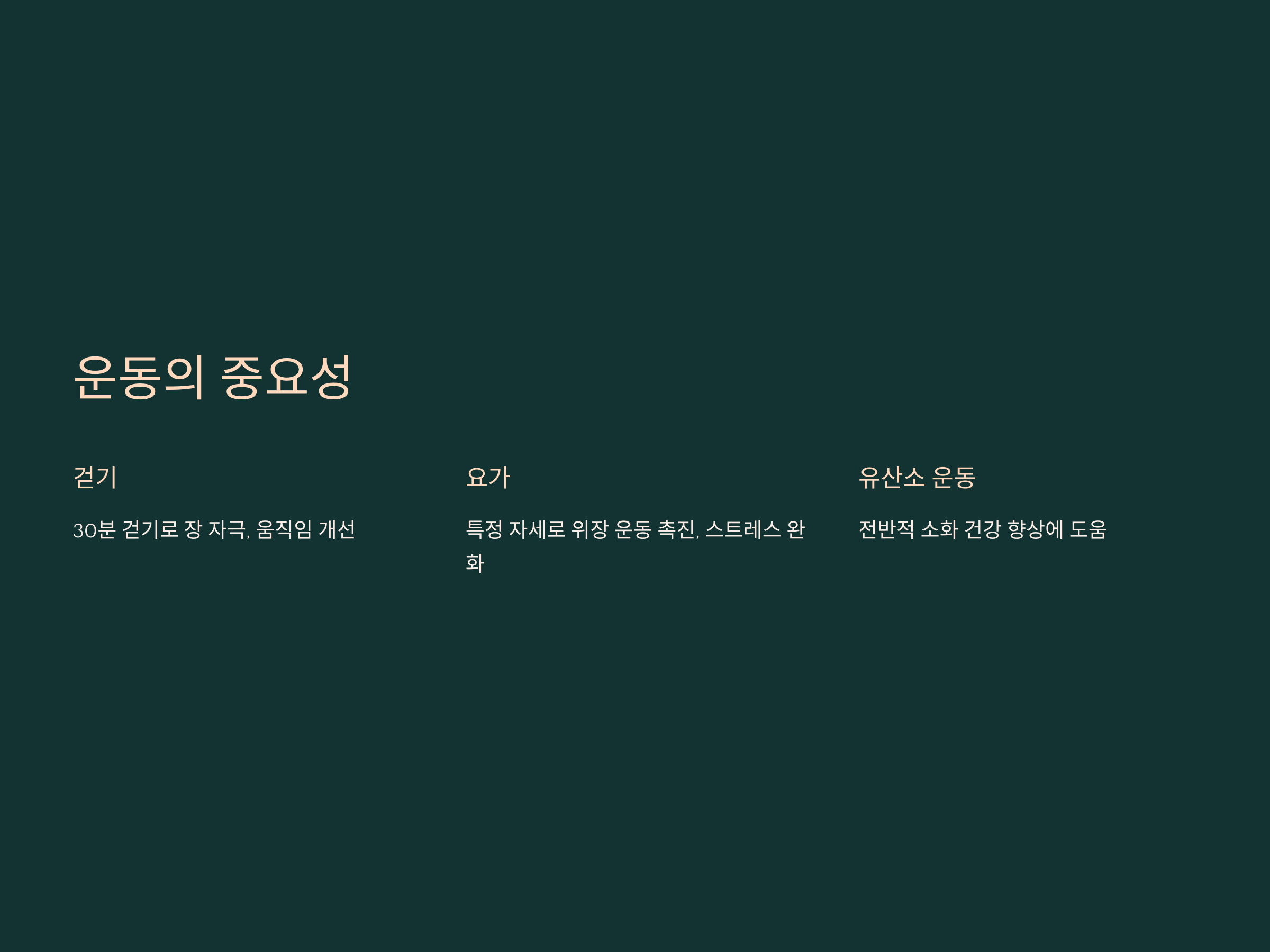 위장 운동을 촉진시키기 위해서는 규칙적인 운동이 필수적입니다. 운동은 장의 운동을 촉진시키고, 전반적인 소화 건강을 향상시키는 데 도움을 줍니다. 가벼운 유산소 운동, 걷기, 요가 등을 꾸준히 실천하는 것이 매우 효과적입니다.