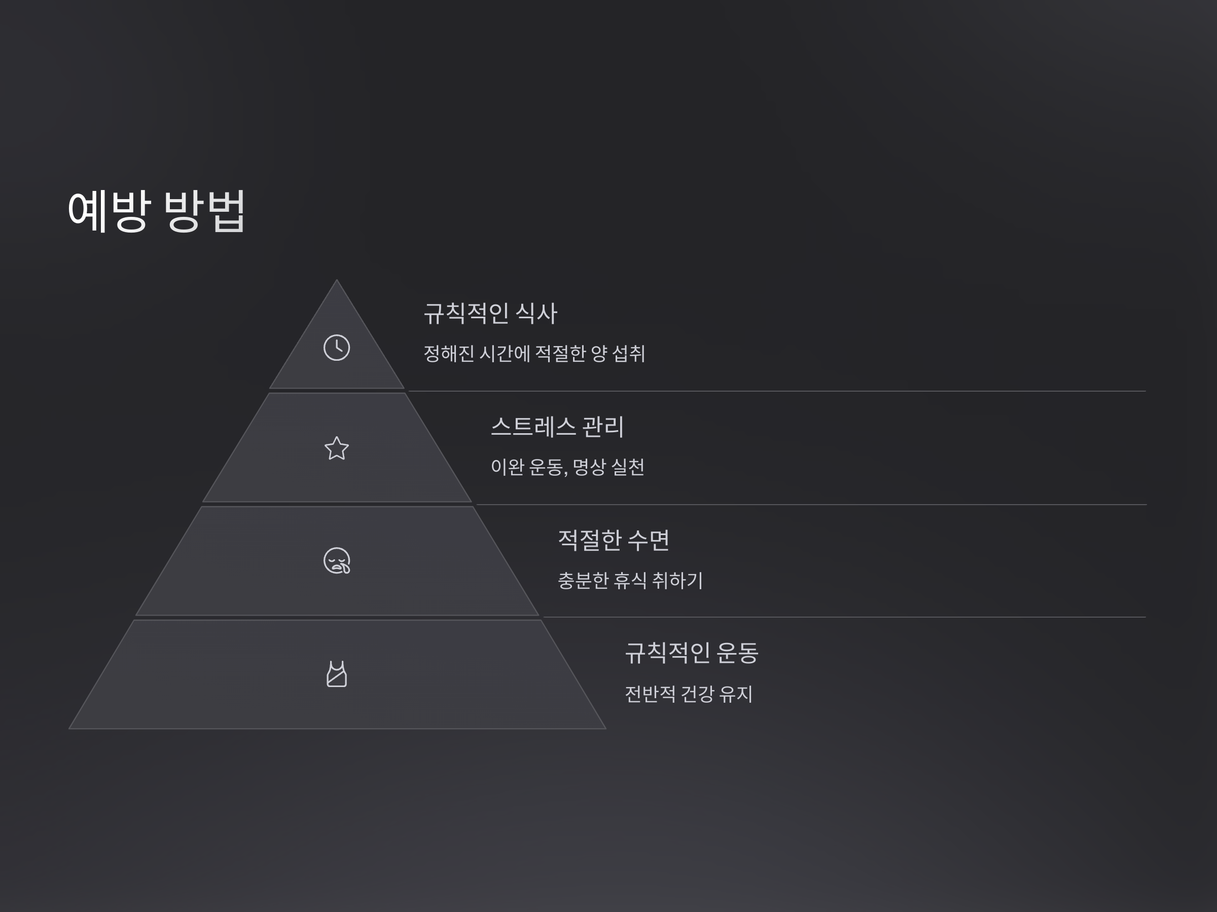 또한, 적절한 수면을 취하고, 운동을 통해 전반적인 건강을 유지하는 것이 위장 건강에 도움이 됩니다. 과도한 음주나 흡연은 위장에 자극을 주기 때문에 이러한 습관을 피하는 것이 좋습니다. 위 정체 증후군은 생활습관의 변화만으로도 충분히 예방할 수 있습니다.