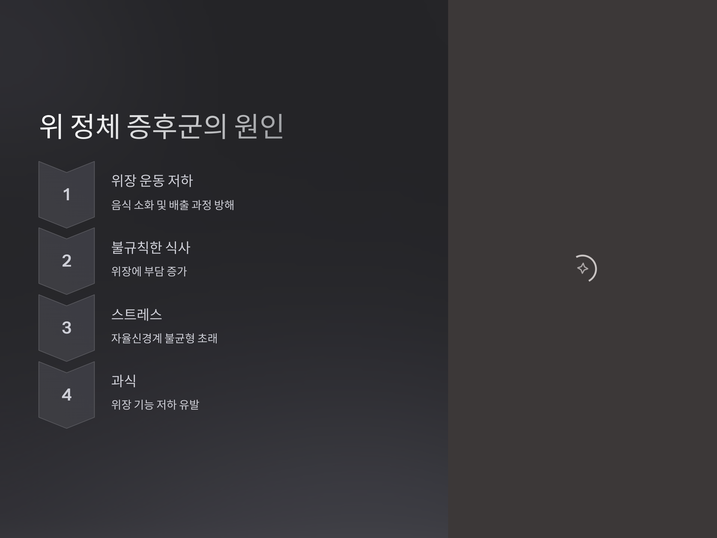 위 정체 증후군의 원인은 다양하지만, 주요한 원인으로는 위장 운동의 저하, 불규칙한 식사 시간, 과식, 스트레스 등이 있습니다. 위장은 음식을 소화하고 배출하는 중요한 역할을 하며, 이 과정이 원활하게 이루어지지 않으면 위 정체 증후군이 발생합니다.