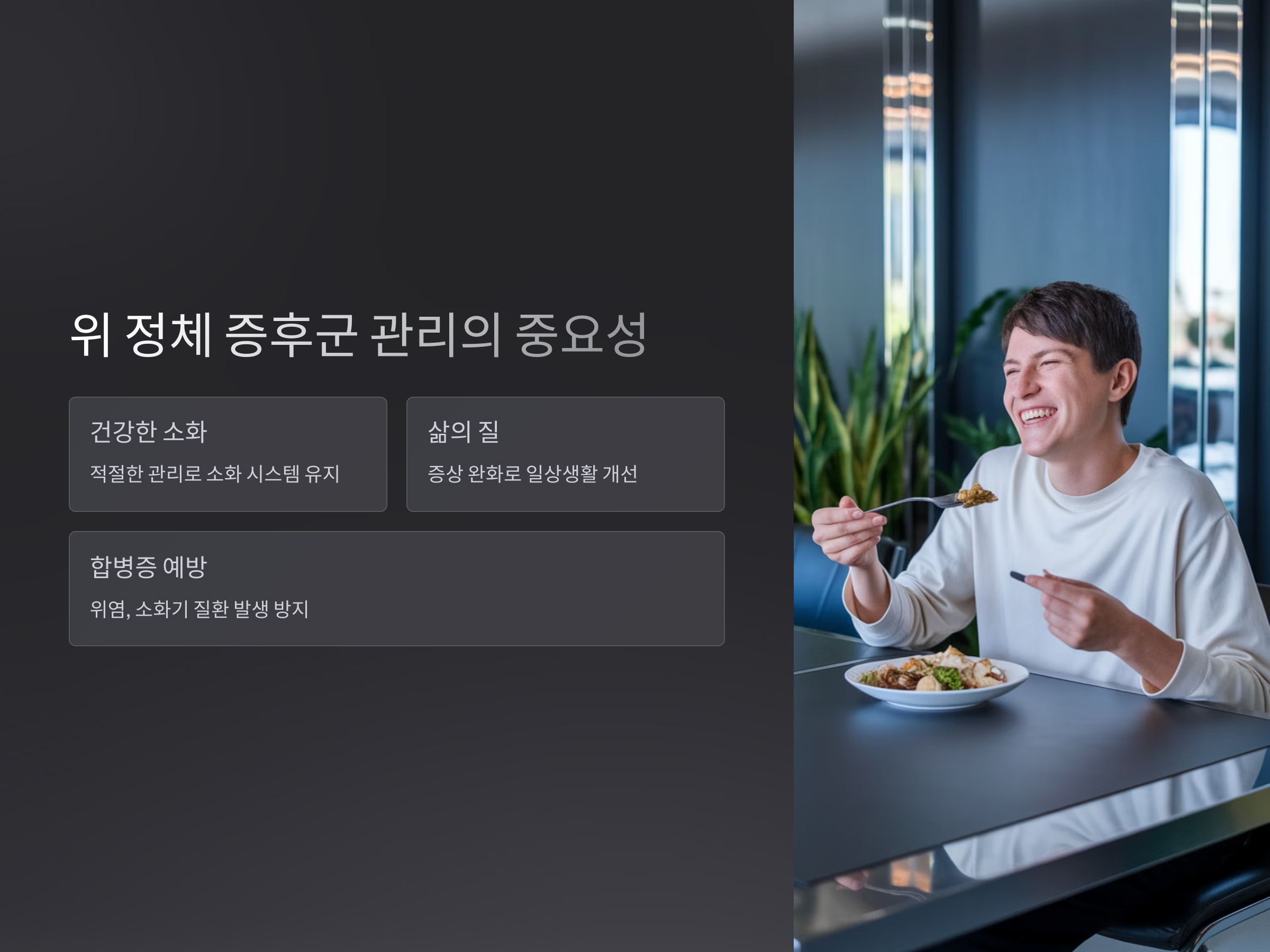 위 정체 증후군은 제대로 관리하지 않으면 건강에 큰 영향을 미칠 수 있습니다. 소화불량과 식욕 감퇴 등의 증상이 자주 발생한다면, 이를 무시하지 말고 적절한 치료와 생활습관 개선이 필요합니다. 규칙적인 식사와 스트레스 관리, 적절한 운동이 중요한 예방책이 될 수 있습니다. 만약 증상이 지속되거나 심해지면 전문가의 상담을 받는 것이 필수적입니다. 위 정체 증후군을 미리 예방하고 관리하여 건강한 소화 시스템을 유지하는 것이 중요합니다.