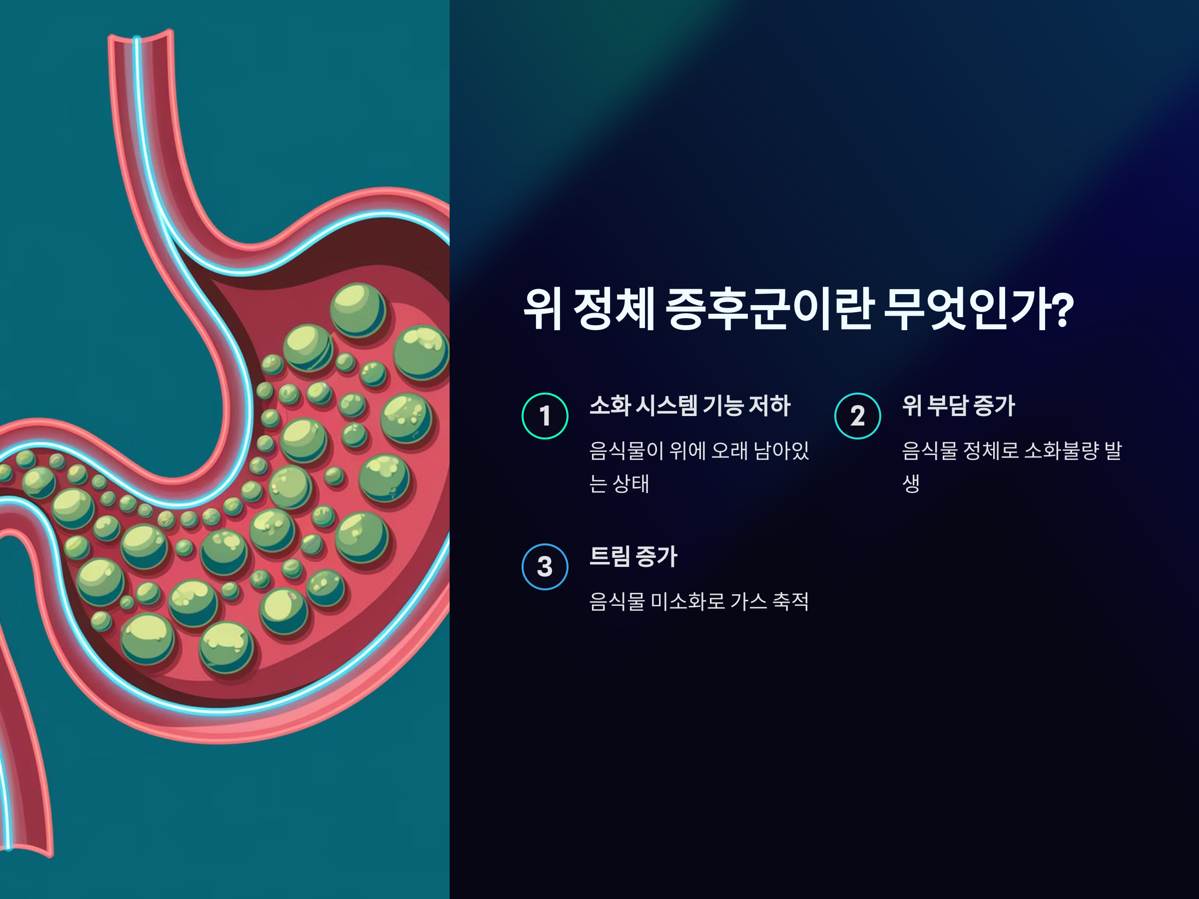 위 정체 증후군은 소화 시스템의 기능이 제대로 작동하지 않아서 음식물이 위에 오래 남아 있는 상태를 말합니다. 정상적인 소화는 음식물이 위를 빠져나가면서 소장이 소화할 준비를 해야 하는데, 이 과정이 원활하게 이루어지지 않으면 위에 음식물이 계속 쌓이게 됩니다. 결과적으로 위에 부담이 가해지며 소화불량이 발생하고, 트림도 증가할 수 있습니다.