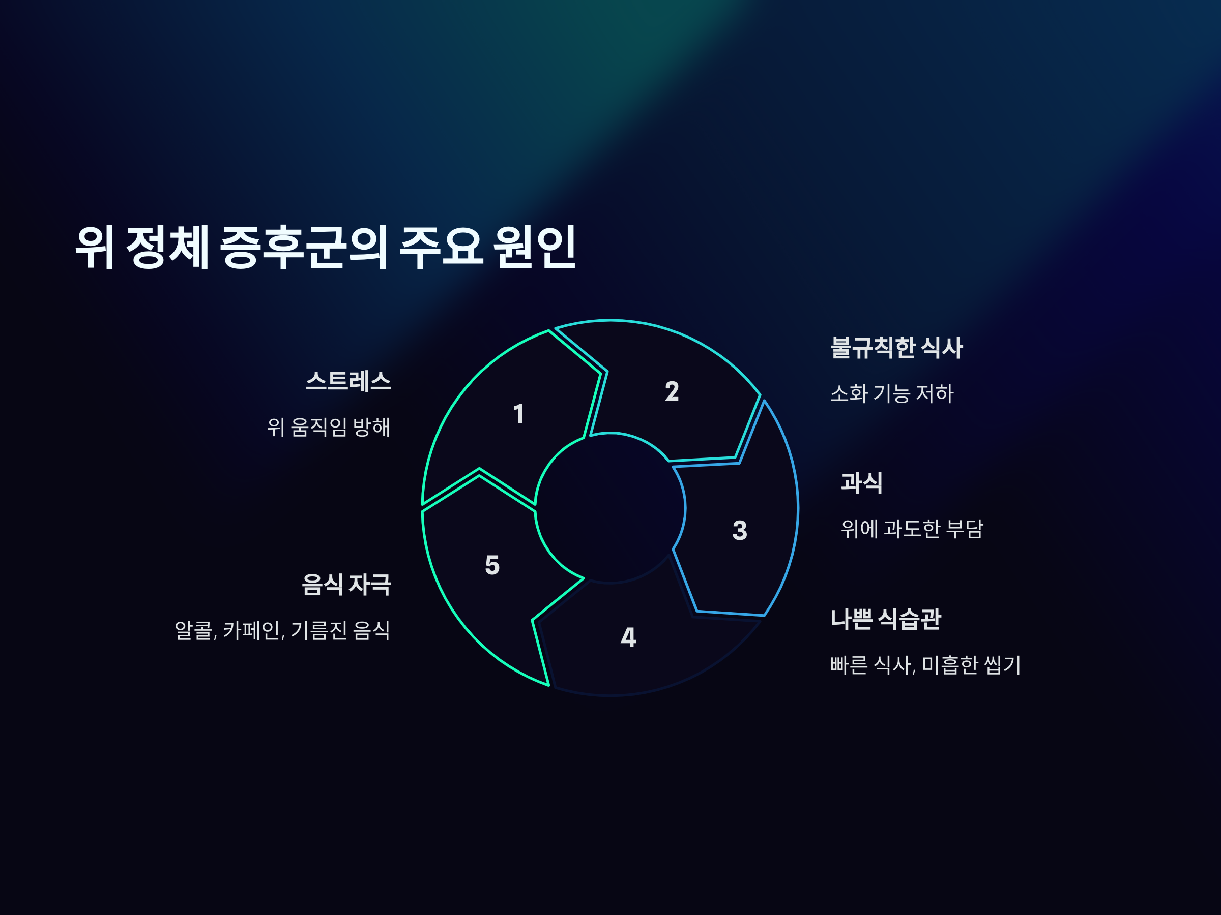 위 정체 증후군은 다양한 원인으로 발생할 수 있습니다. 가장 흔한 원인 중 하나는 스트레스입니다. 스트레스는 위의 움직임을 방해하고, 위가 음식을 처리하는 능력을 떨어뜨립니다. 또한, 불규칙한 식사 시간과 과식도 큰 원인입니다. 과식은 위에 너무 많은 음식을 넣어 소화가 제대로 이루어지지 않게 만듭니다.