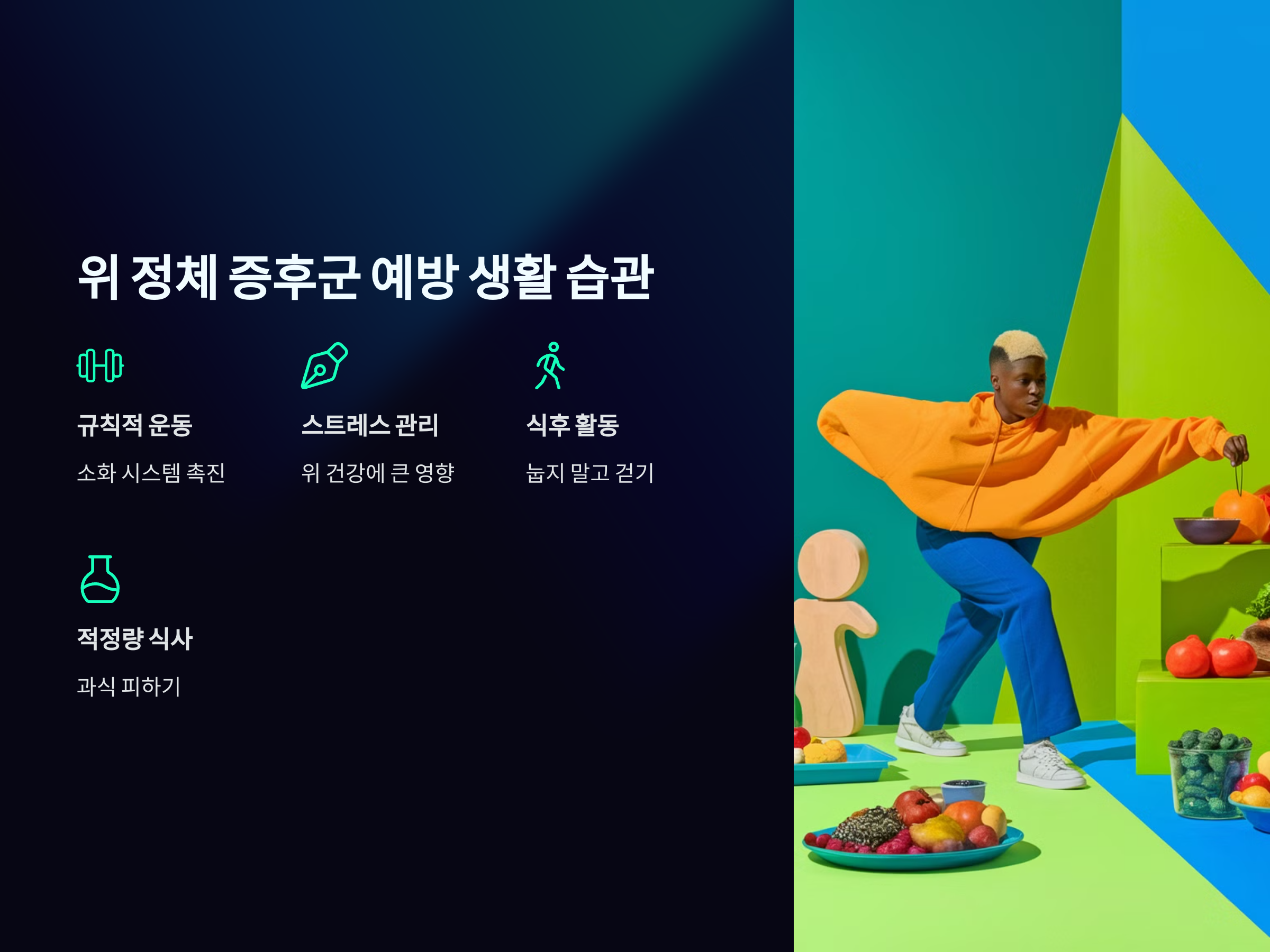 위 정체 증후군을 예방하려면 일상에서 몇 가지 중요한 생활 습관을 지키는 것이 중요합니다. 첫째, 규칙적인 운동을 꾸준히 하는 것입니다. 운동은 소화 시스템을 촉진하고, 위가 음식을 처리하는 데 도움을 줍니다. 또한, 스트레스를 관리하는 것도 예방의 중요한 부분입니다.