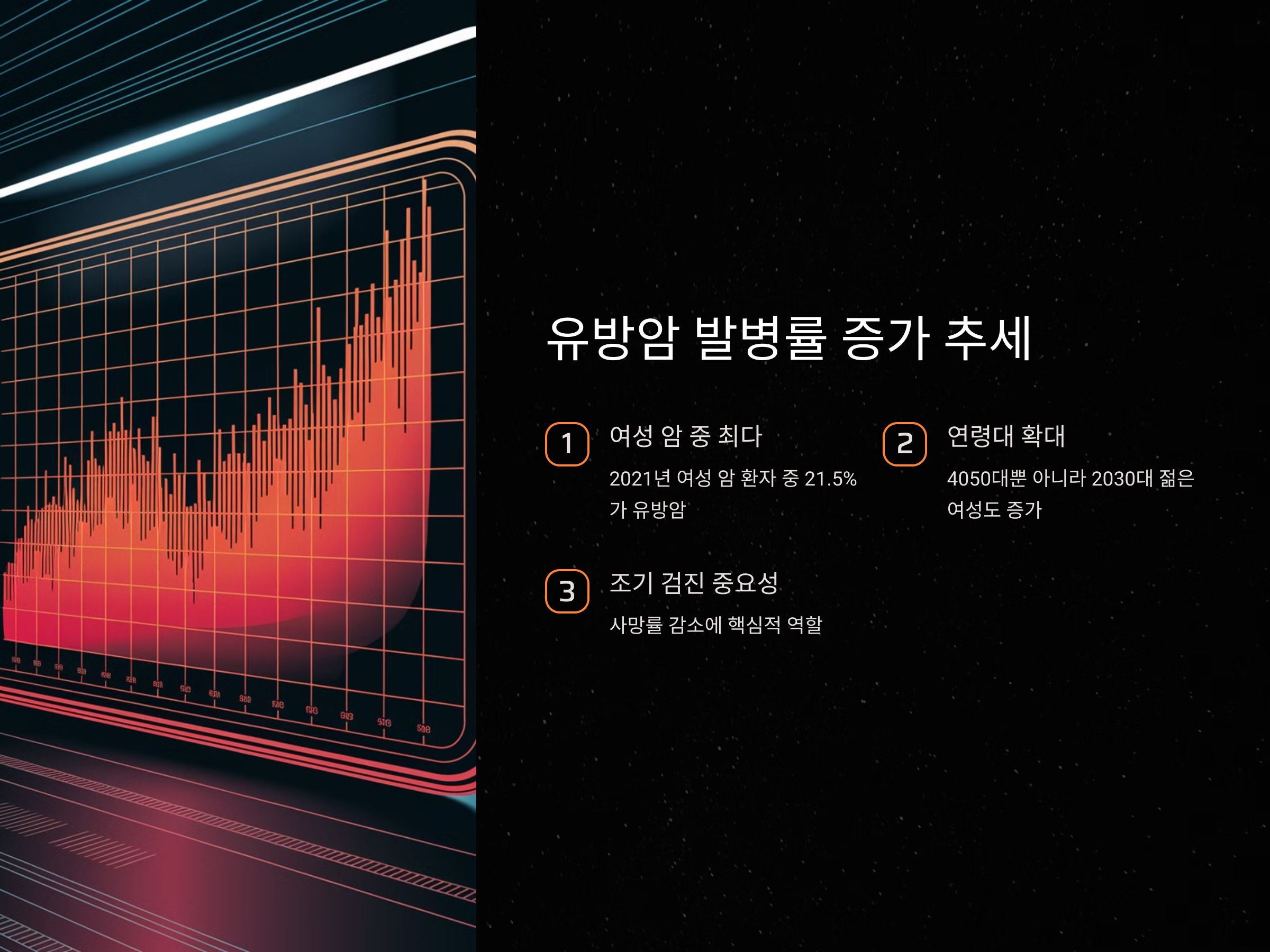 국가암등록통계에 따르면, 2021년 기준 전체 여성 암 환자 중 21.5%가 유방암 환자로, 이는 여성 암 발생률 중 가장 높은 수치입니다. 특히 40~50대 중년 여성뿐만 아니라 20~30대 젊은 여성에서도 유방암 발생이 증가하는 추세입니다. citeturn0search28 이러한 상황에서 조기 검진은 유방암으로 인한 사망률을 낮추는 데 중요한 역할을 합니다.