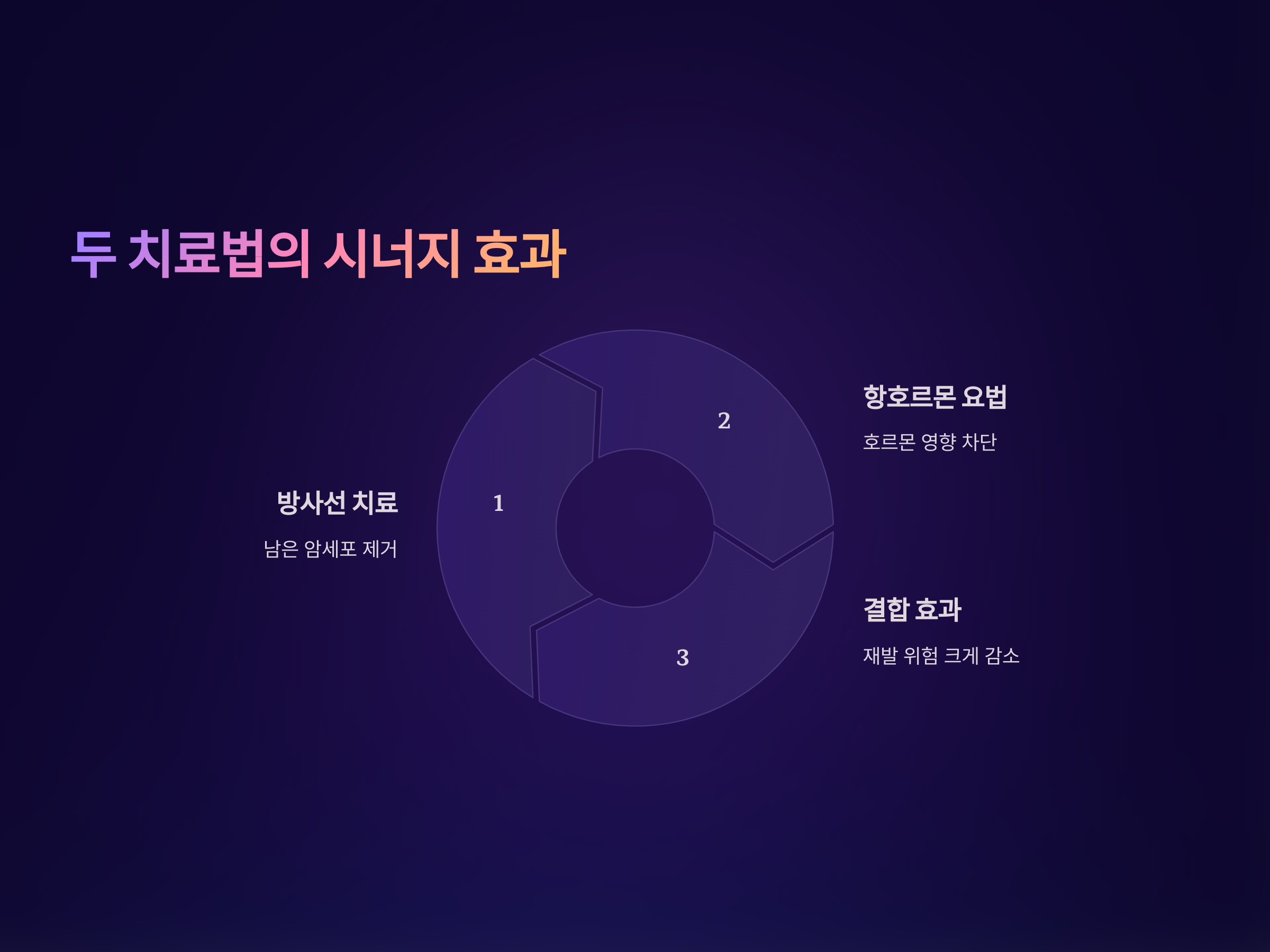 방사선 치료와 항호르몬 요법을 동시에 진행하면, 암세포가 더 이상 성장할 수 없도록 방어망을 강화할 수 있습니다. 특히, 방사선 치료로 암이 완전히 제거되지 않은 경우, 항호르몬 요법이 치료의 효과를 더욱 극대화합니다.