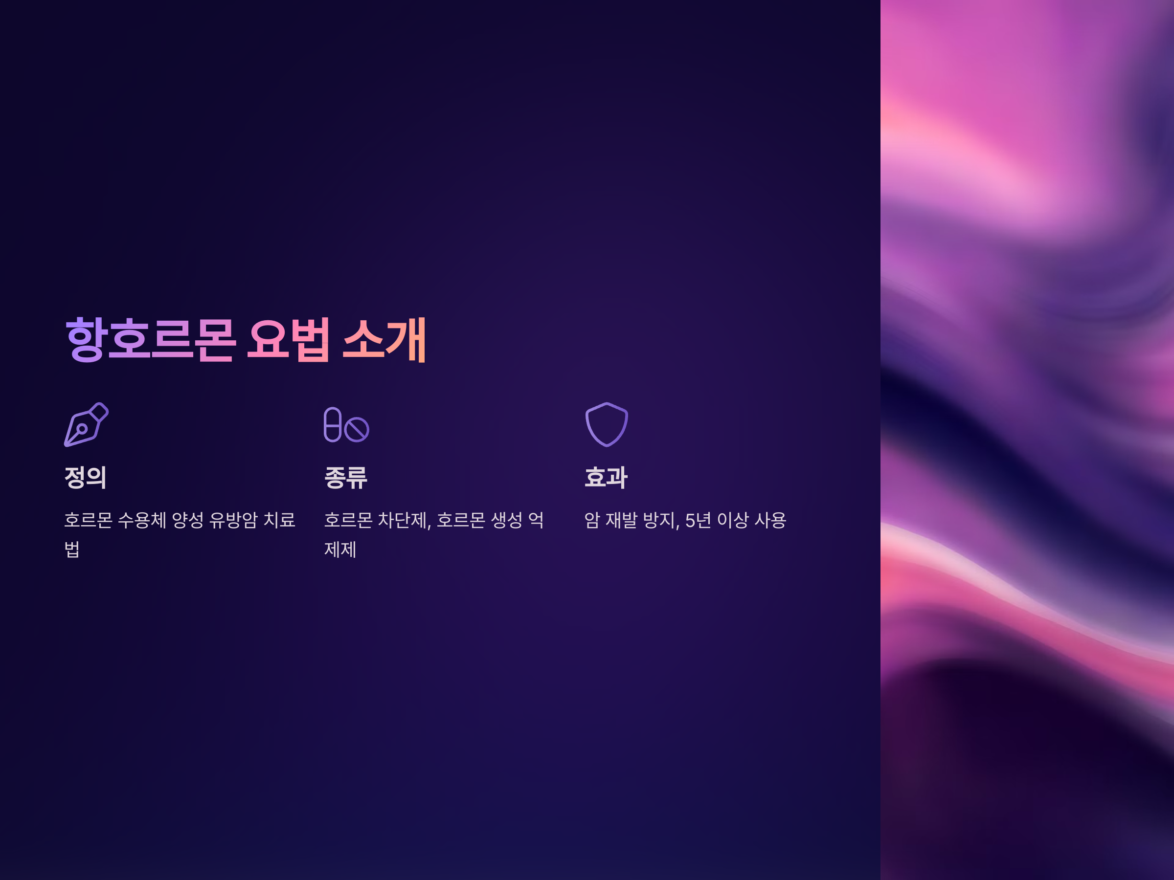 항호르몬 요법은 호르몬 수용체 양성(ER+/PR+) 유방암에 사용되는 치료법으로, 암세포가 호르몬에 의해 성장하는 것을 막는 치료입니다. 유방암 중 일부는 여성 호르몬인 에스트로겐과 프로게스테론에 의해 자라게 됩니다. 항호르몬 요법은 이러한 호르몬이 암세포에 영향을 미치는 것을 차단하여 암의 성장을 억제합니다.