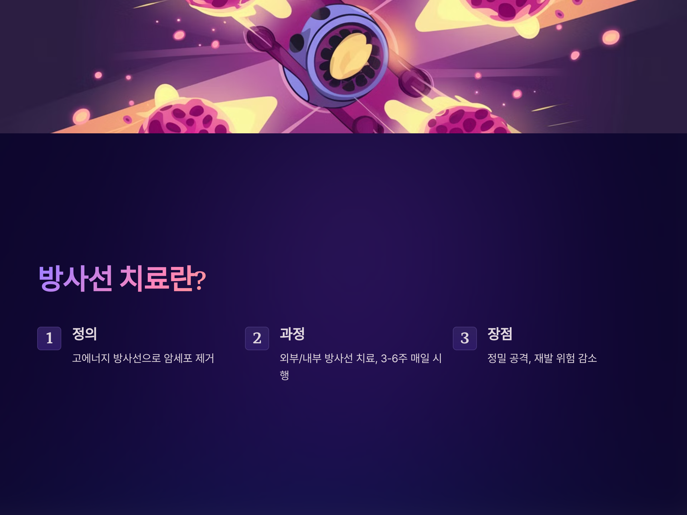 방사선 치료는 고에너지 방사선을 이용해 암세포를 죽이거나 성장 속도를 늦추는 치료 방법입니다. 유방암에서는 수술 후 남아 있을 수 있는 미세한 암세포를 제거하고, 암이 재발하는 것을 방지하기 위해 자주 사용됩니다.