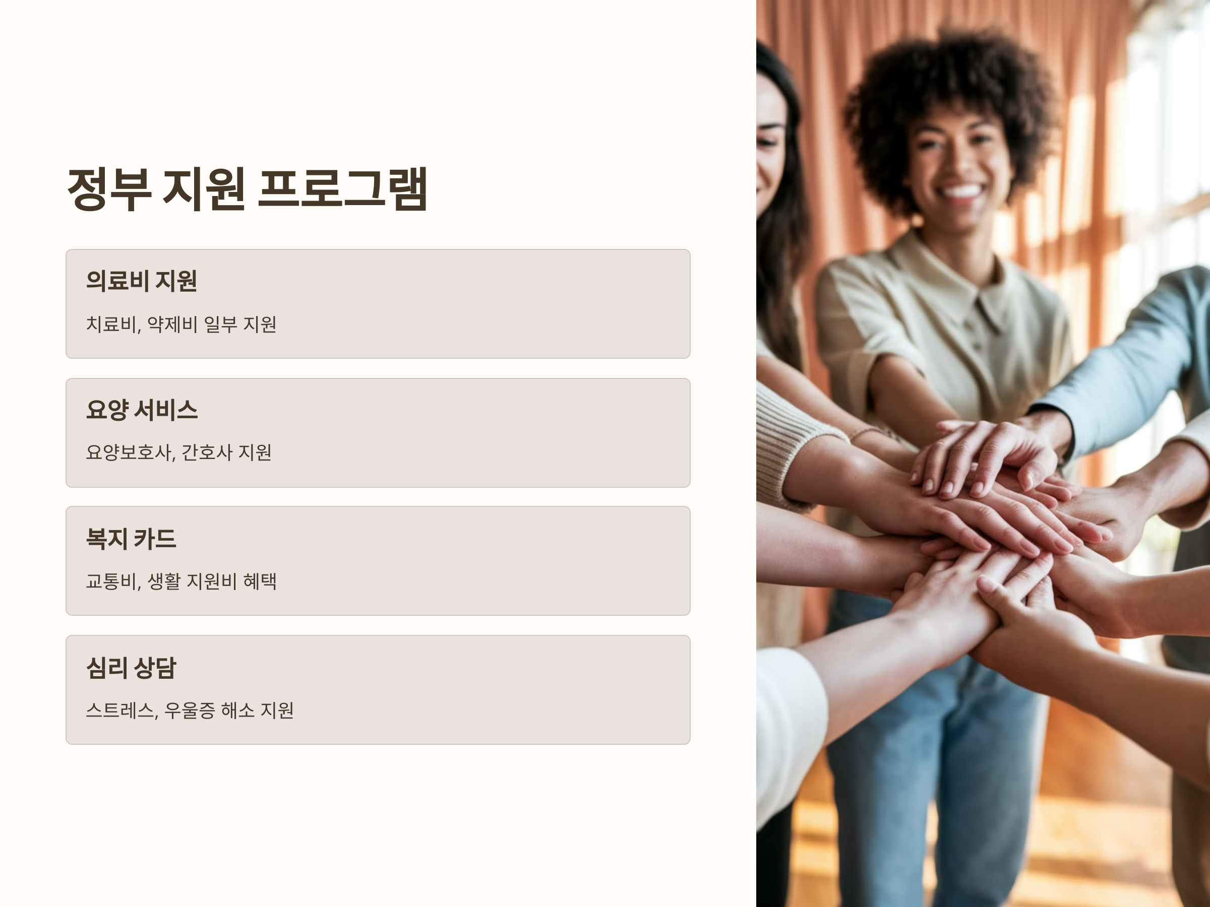 유방암 치료 후 림프부종을 겪고 있는 환자들은 정부와 각종 지원 기관에서 제공하는 다양한 지원 프로그램을 통해 경제적, 정서적 도움을 받을 수 있습니다. 정부는 암 환자들을 위해 여러 가지 지원 제도를 운영하고 있으며, 특히 림프부종 관리와 관련된 다양한 혜택을 제공하고 있습니다.