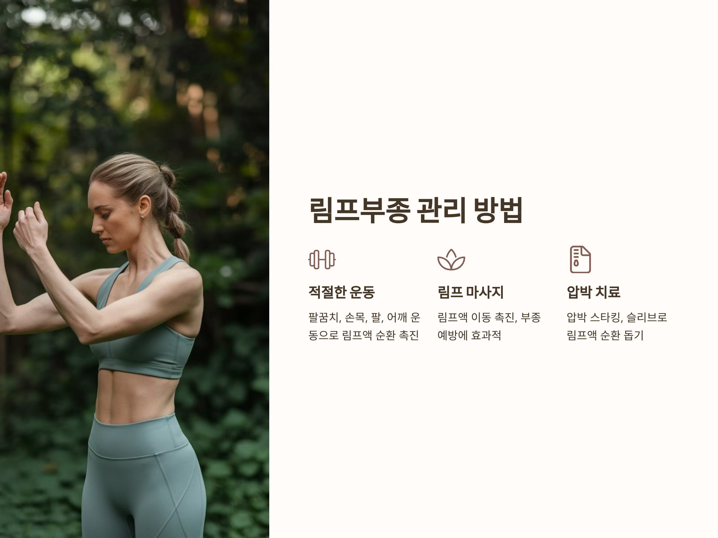 림프부종을 예방하고 초기 증상을 관리하는 데 있어 가장 중요한 것은 적절한 운동과 림프액의 순환을 돕는 마사지입니다. 특히 팔꿈치, 손목, 팔, 어깨 부위의 운동을 통해 림프액의 흐름을 돕는 것이 중요합니다. 또한, 림프 마사지는 림프액의 이동을 촉진시키고 부종을 예방하는데 효과적입니다.