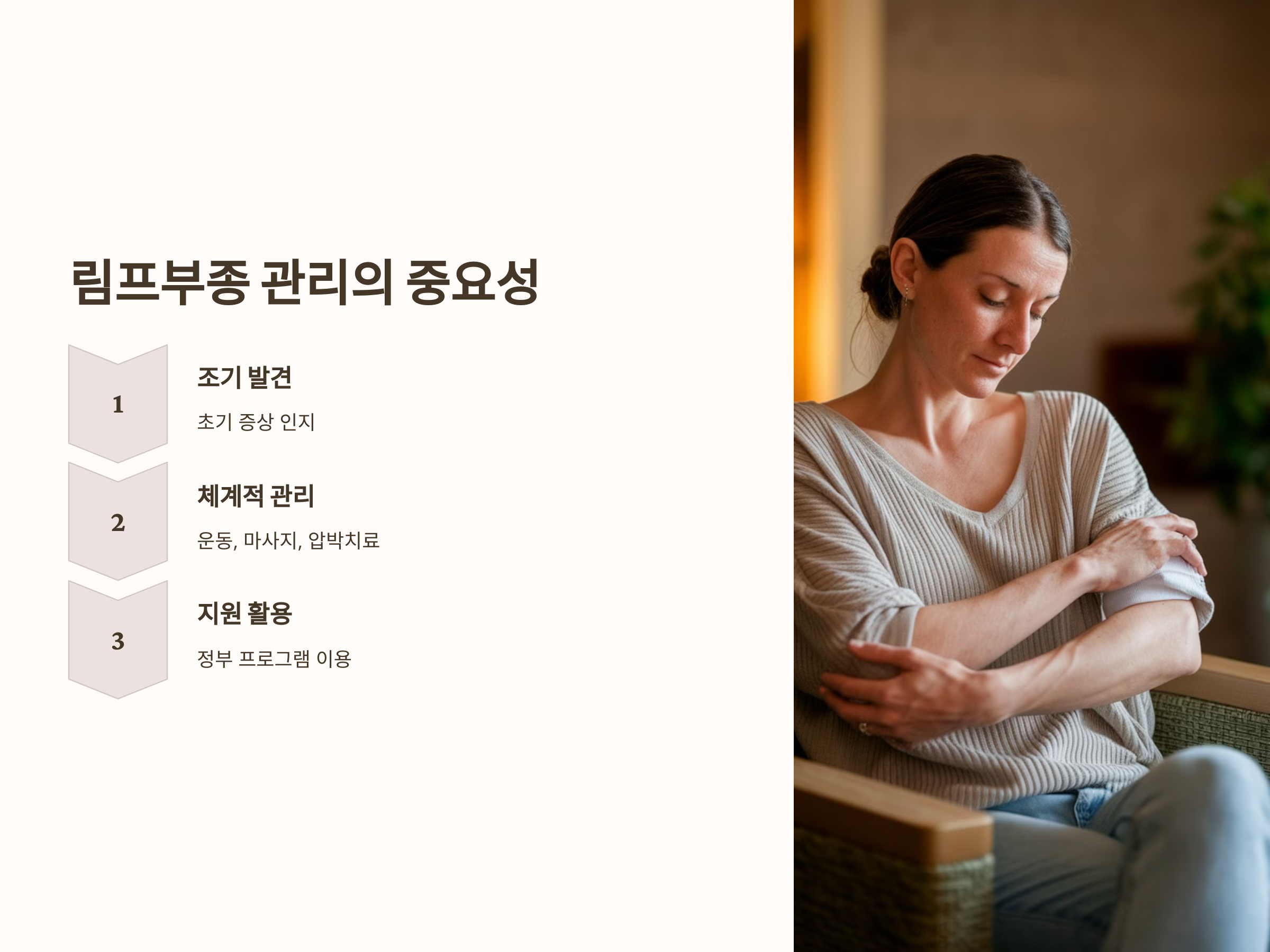 유방암 치료 후 림프부종을 관리하는 데 있어 중요한 것은 조기 발견과 체계적인 관리입니다. 운동과 마사지, 압박치료 등을 통해 증상을 완화할 수 있으며, 정부의 다양한 지원 프로그램을 통해 경제적 부담을 덜 수 있습니다. 유방암 환자들은 이러한 관리 방법과 지원 프로그램을 통해 보다 나은 삶을 영위할 수 있습니다. 치료 후 증상에 대해 걱정이 된다면 전문가와 상의하고, 제공되는 지원을 충분히 활용하는 것이 중요합니다.
