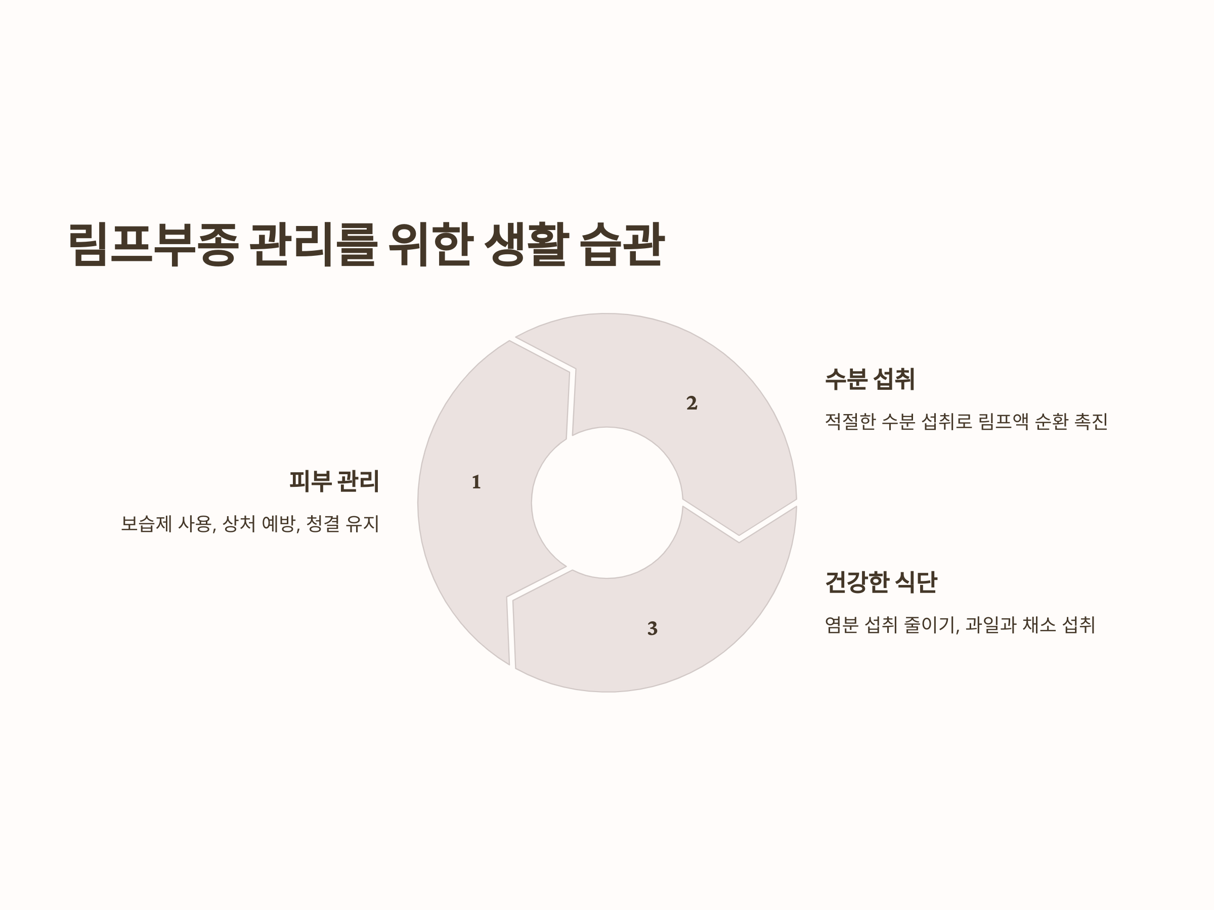 림프부종을 관리하는 데 있어 적절한 수분 섭취는 매우 중요합니다. 또한 염분 섭취를 줄이고, 건강한 식단을 유지하는 것이 부종을 예방하는 데 도움이 됩니다. 과일과 채소를 많이 섭취하고, 염분이 적은 음식을 선택하는 것이 중요합니다.