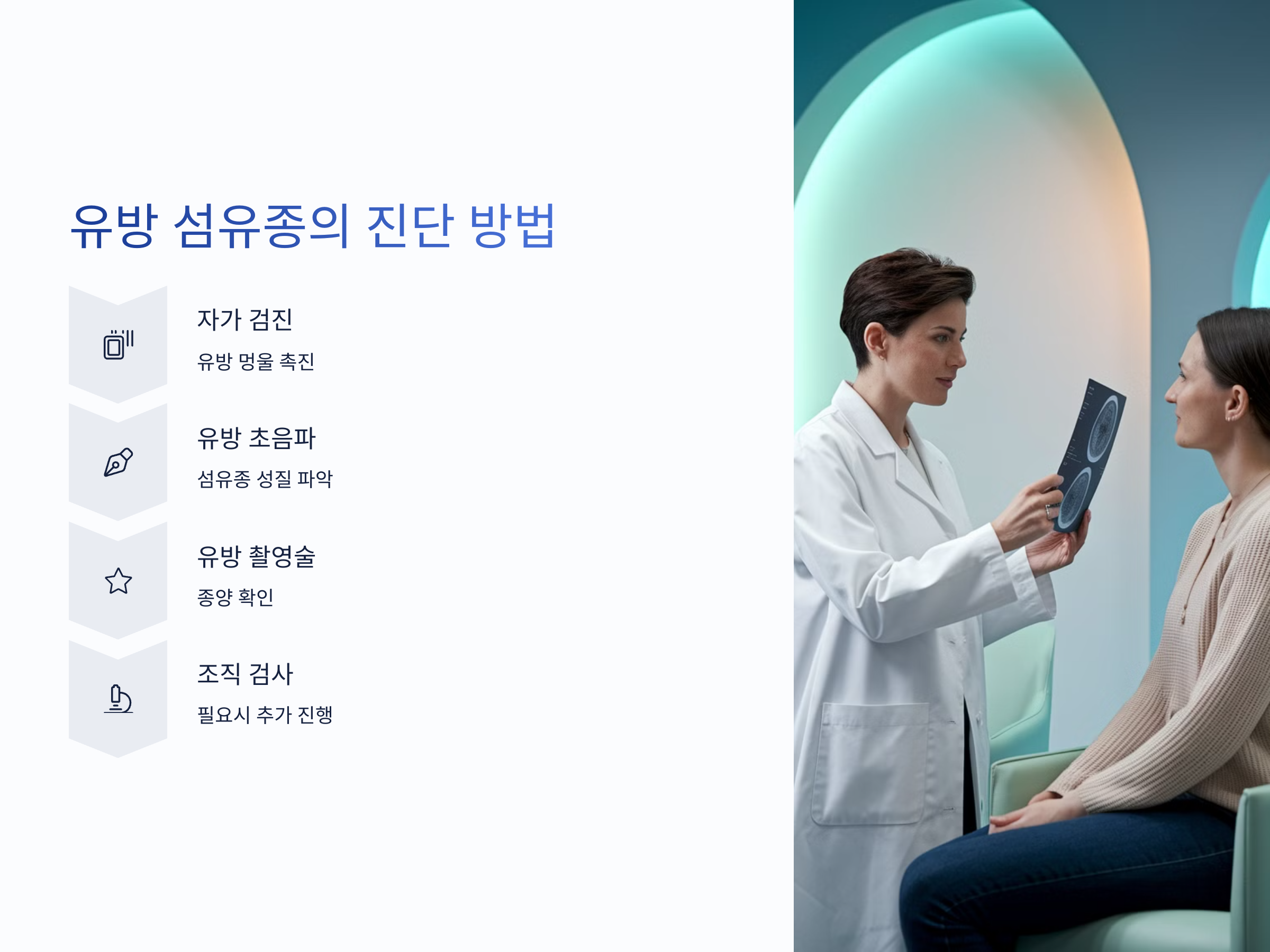 유방 섬유종이 의심되는 경우, 가장 중요한 것은 정확한 진단을 받는 것입니다. 일반적으로 유방의 멍울을 느낀 후, 의료기관에서 유방 초음파나 유방 촬영술(맘모그램)을 통해 확인할 수 있습니다. 유방 초음파는 섬유종의 성질을 파악하는 데 유용하며, 맘모그램은 종양이 있는지 확인하는 데 도움을 줍니다.