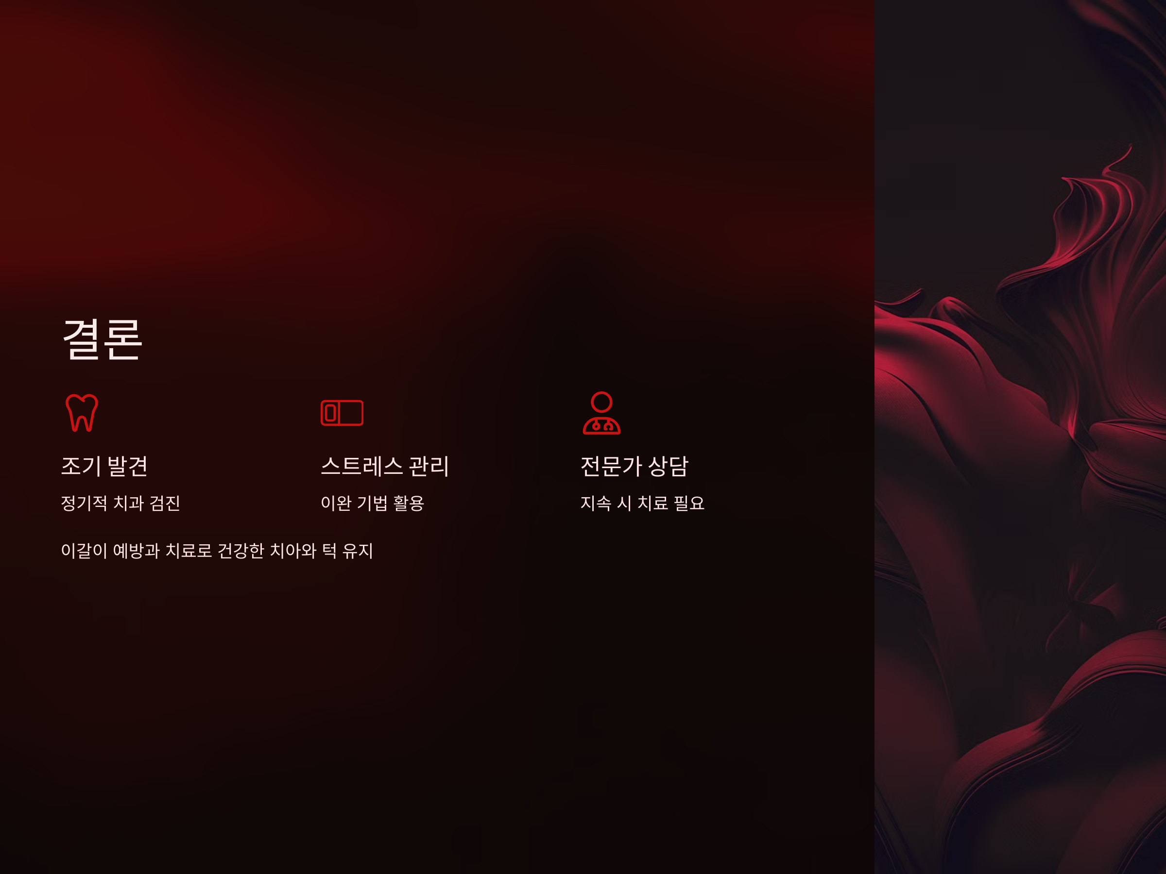 - 정기적인 치과 검진: 이갈이로 인한 치아 마모나 턱 통증을 조기에 발견하여, 더 큰 문제가 발생하기 전에 치료할 수 있습니다.