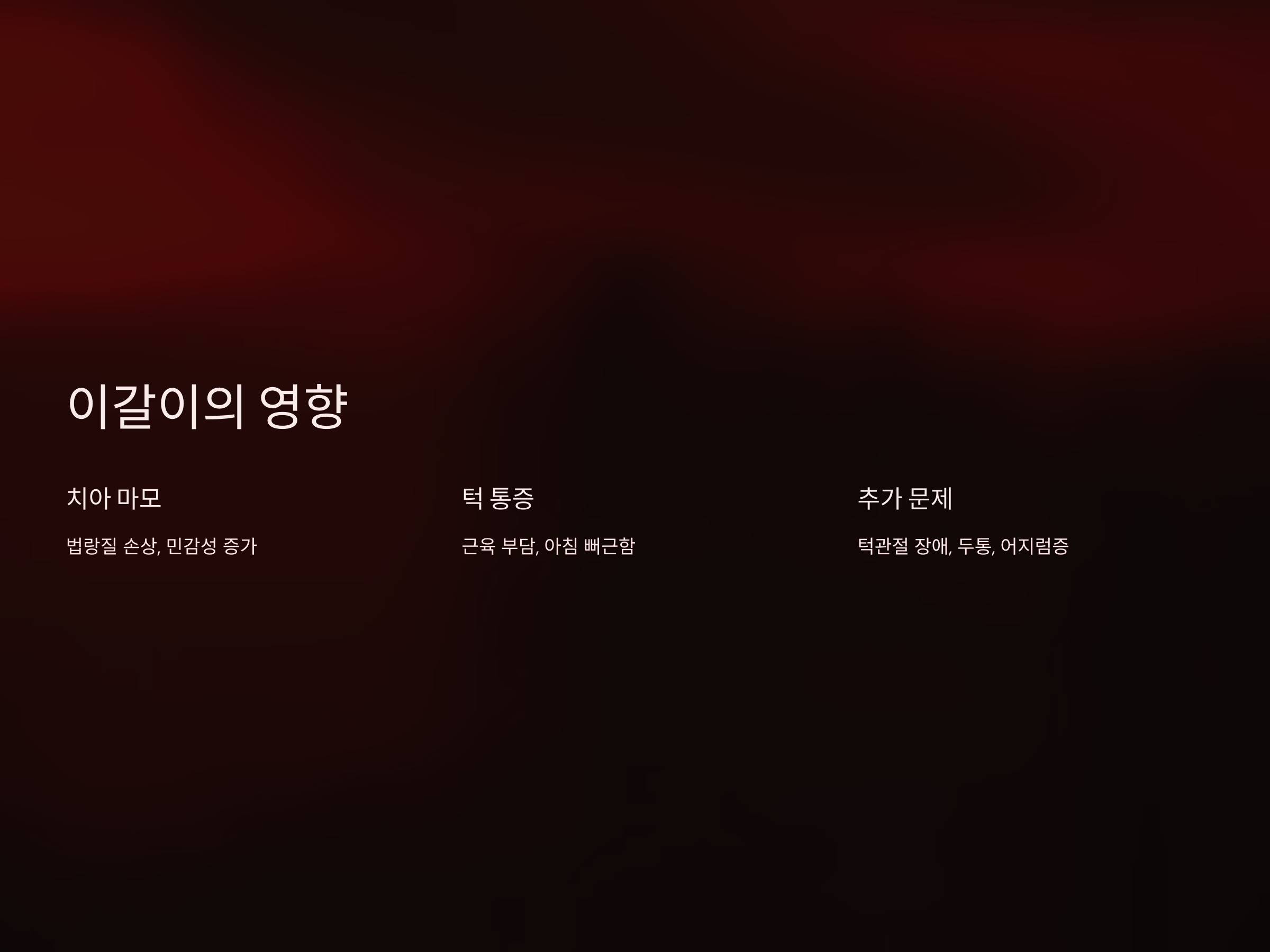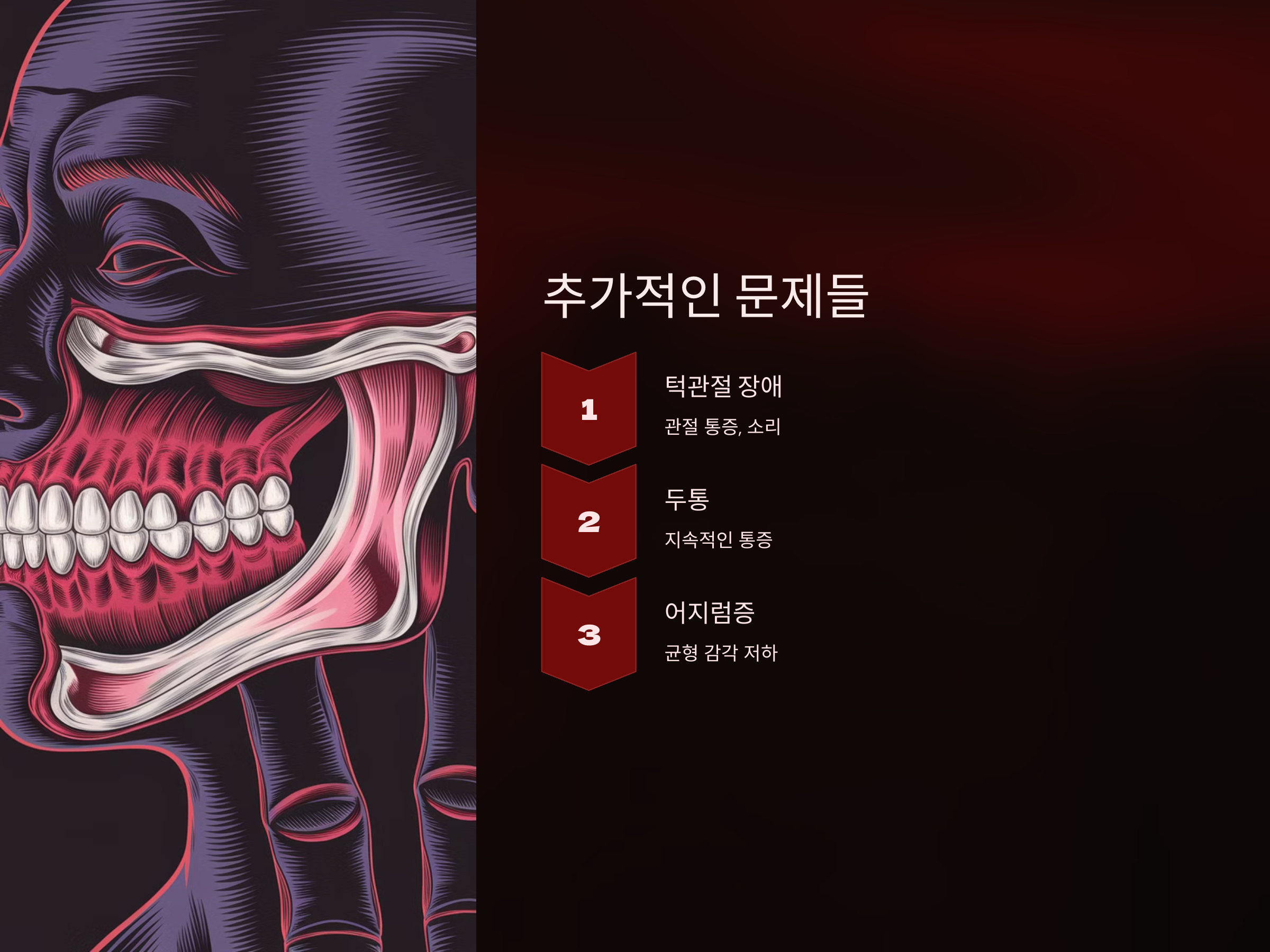 이갈이로 인한 치아 마모와 턱 통증 외에도, 이갈이는 여러 다른 문제들을 일으킬 수 있습니다. 예를 들어, 턱 관절에 문제가 생기거나, 두통이나 어지럼증을 유발할 수 있습니다. 이갈이가 지속적으로 발생하면, 턱 관절에 무리가 가면서 '턱관절 장애'라는 문제로 이어질 수 있습니다. 이는 관절의 통증, 턱이 걸리거나 소리가 나는 현상 등을 동반할 수 있습니다.