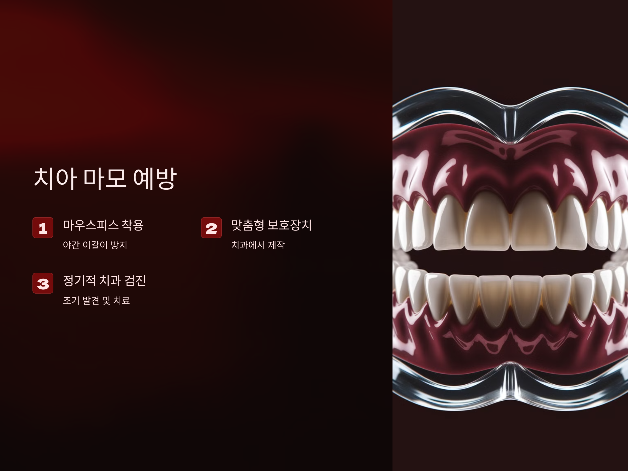 치아 마모를 예방하기 위해서는 치아를 보호하는 방법을 찾아야 합니다. 특히 야간에 이갈이가 일어나는 경우, 이를 보호하는 장치를 착용하는 것이 효과적인 방법이 될 수 있습니다. 또한, 이갈이가 심해질 경우 치과에서 맞춤형 마우스피스를 제공받을 수 있습니다.