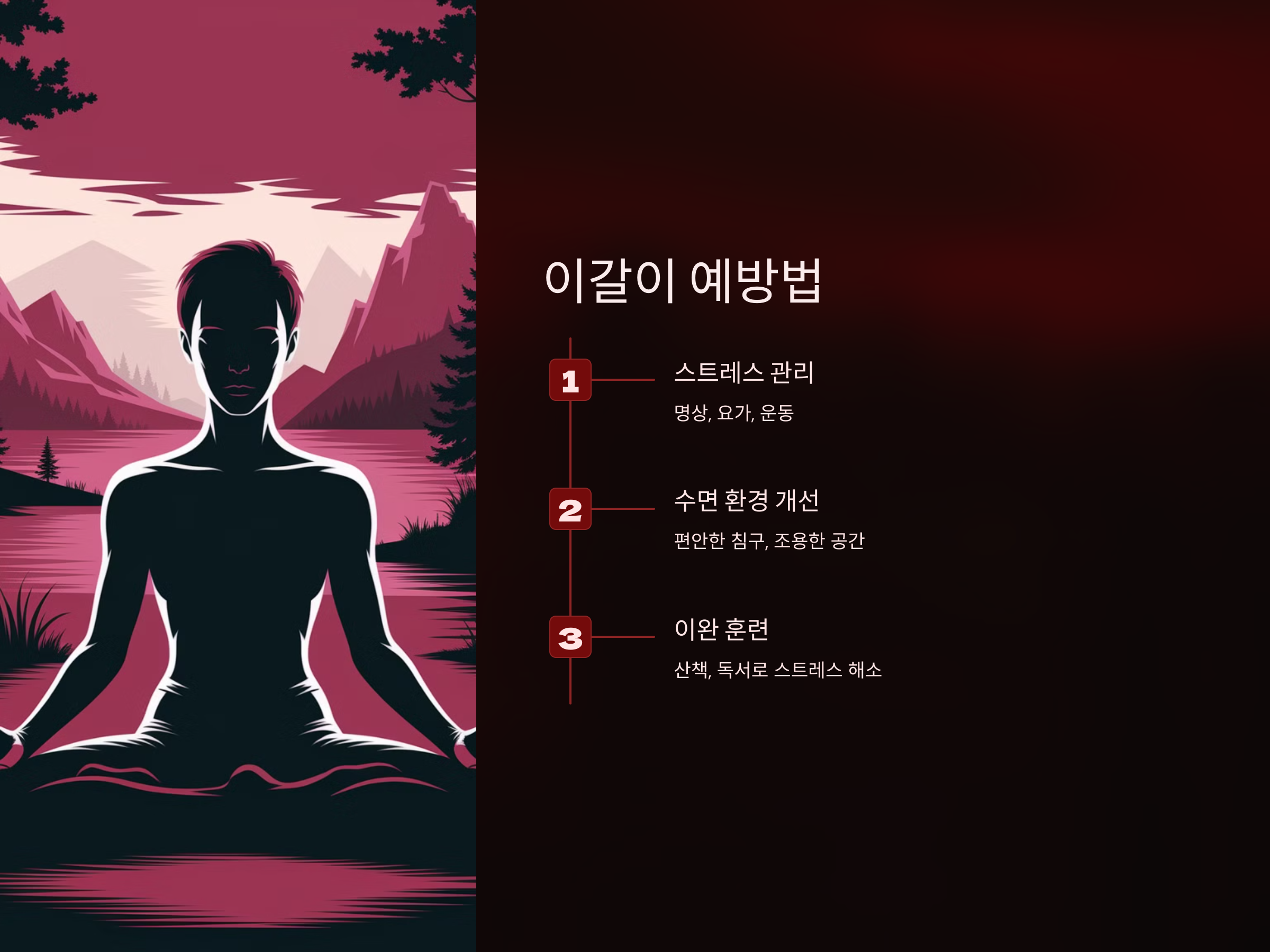 이갈이를 예방하려면 먼저 원인을 파악하는 것이 중요합니다. 스트레스가 주요 원인이라면, 이를 해결하기 위한 방법을 모색해야 합니다. 명상, 요가, 운동 등을 통해 스트레스를 해소하는 것이 효과적일 수 있습니다. 또한, 잠자는 동안 이갈이를 방지하기 위해 마우스피스를 착용하는 것도 좋은 방법입니다.