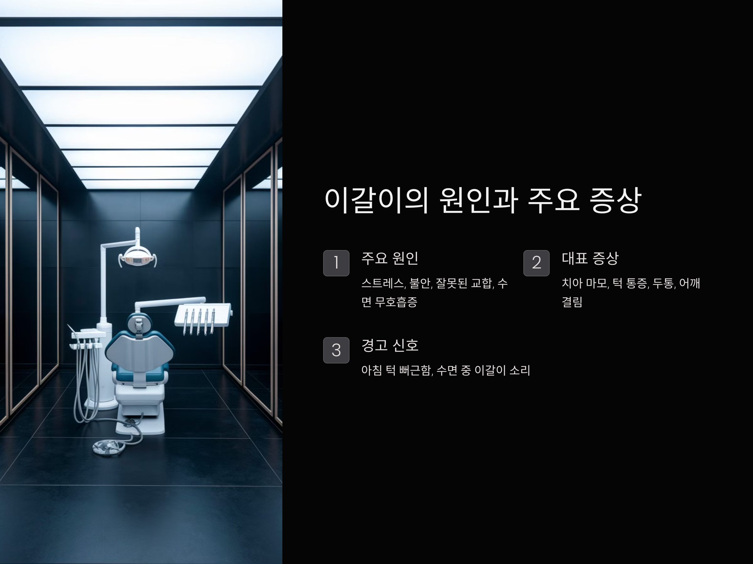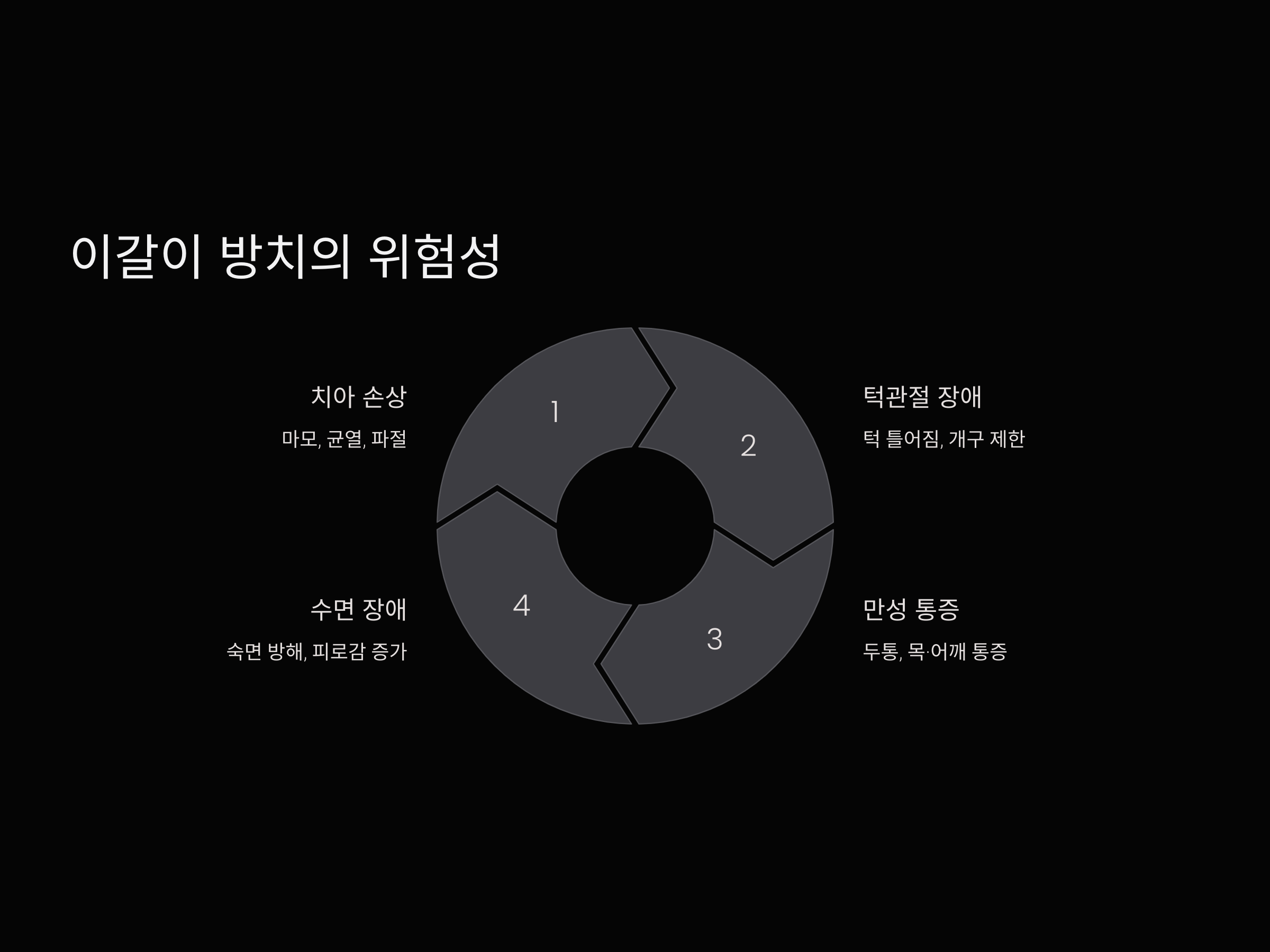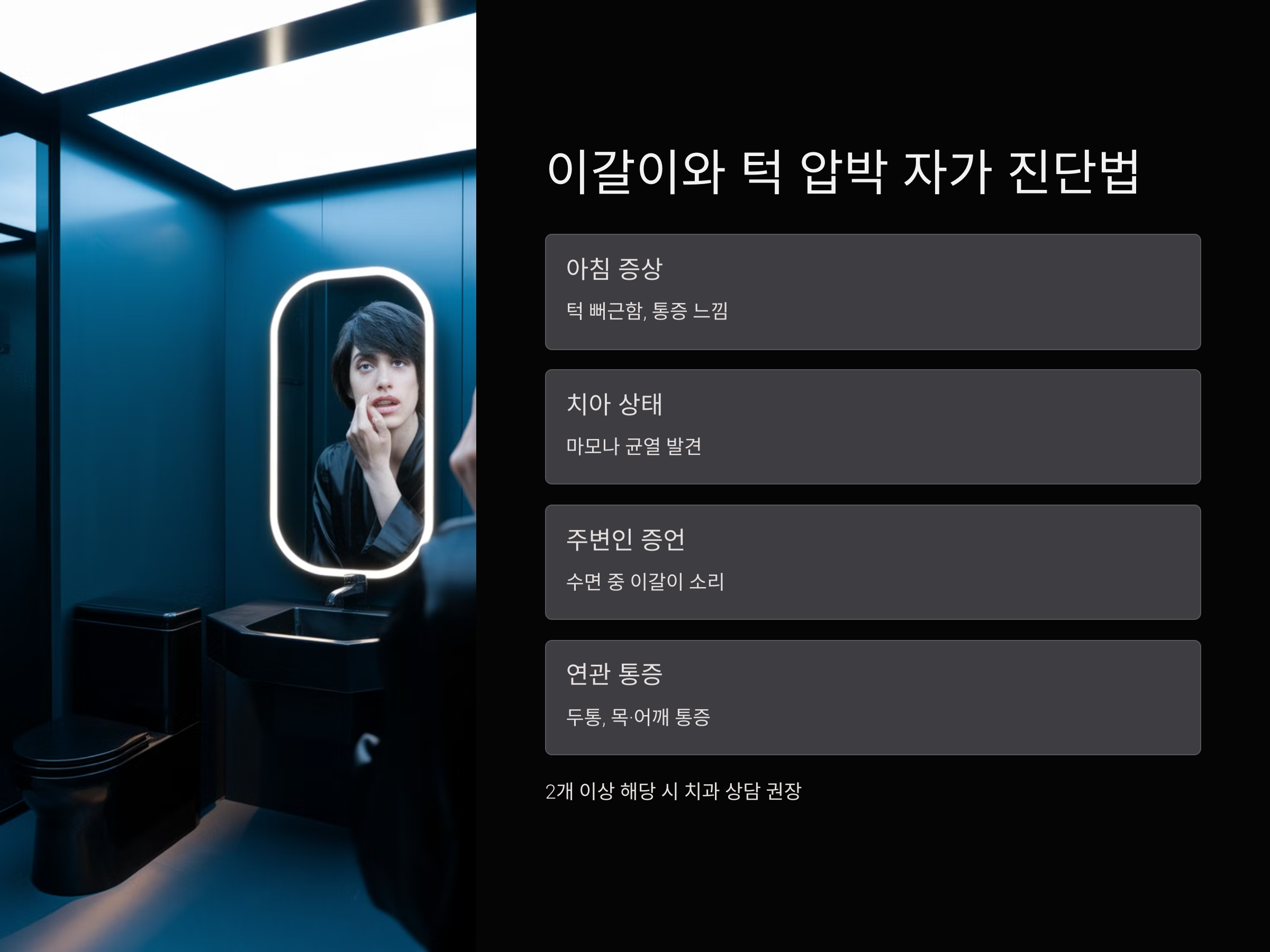 이갈이를 방치하면 단순한 습관이 아닌 건강상의 심각한 문제를 초래할 수 있습니다. 수면 중 턱 압박은 치아 손상, 턱관절 장애, 두통 등의 원인이 되므로 조기 대처가 필수적입니다.