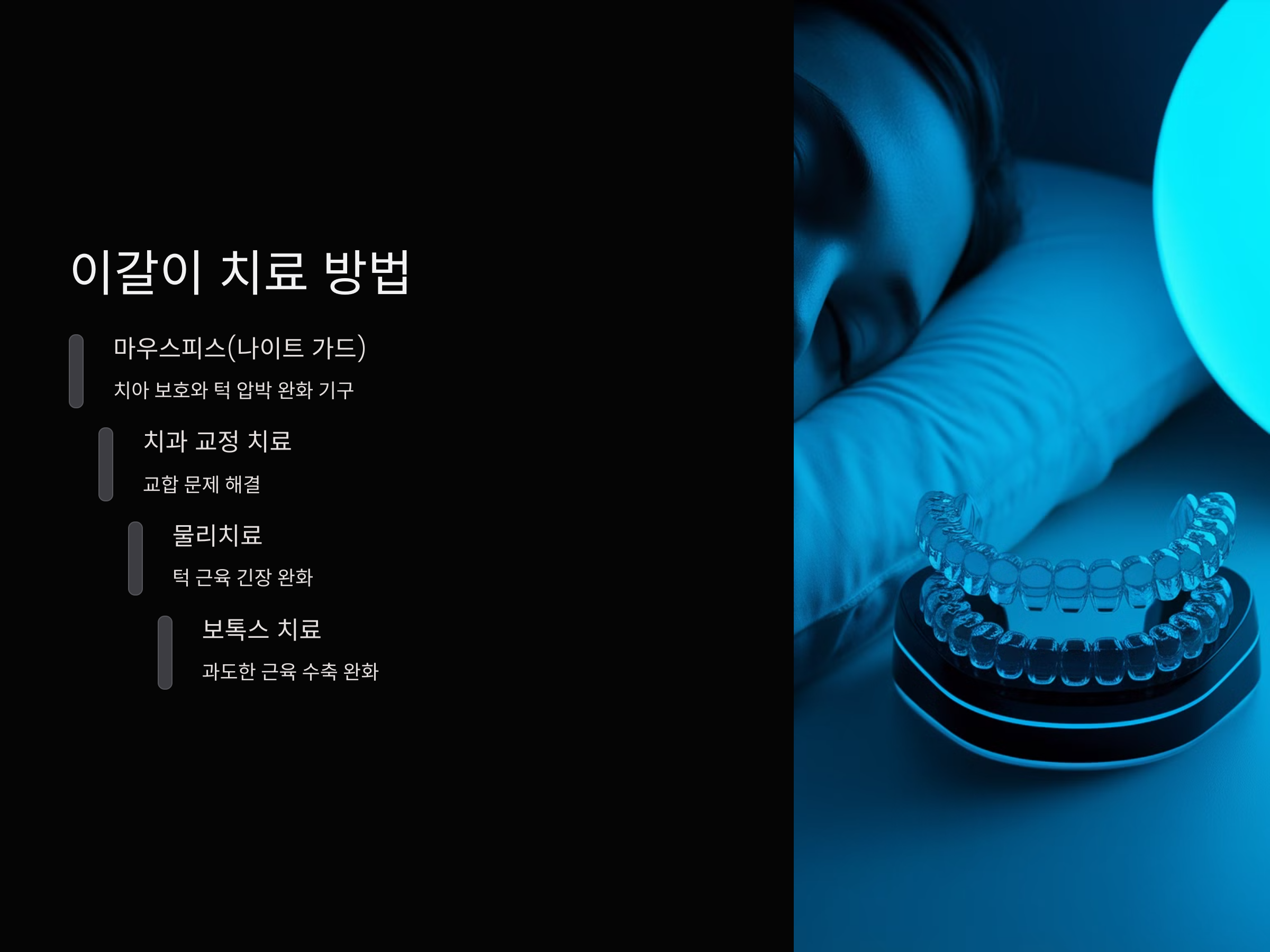 이갈이 치료에는 다양한 방법이 있으며, 증상의 정도에 따라 적절한 해결책을 선택하는 것이 중요합니다. 가장 일반적인 방법은 마우스피스(나이트 가드) 착용입니다. 이는 치아 보호와 턱 압박 완화를 위한 기구로, 수면 중 이를 가는 습관이 있는 사람들에게 효과적입니다.