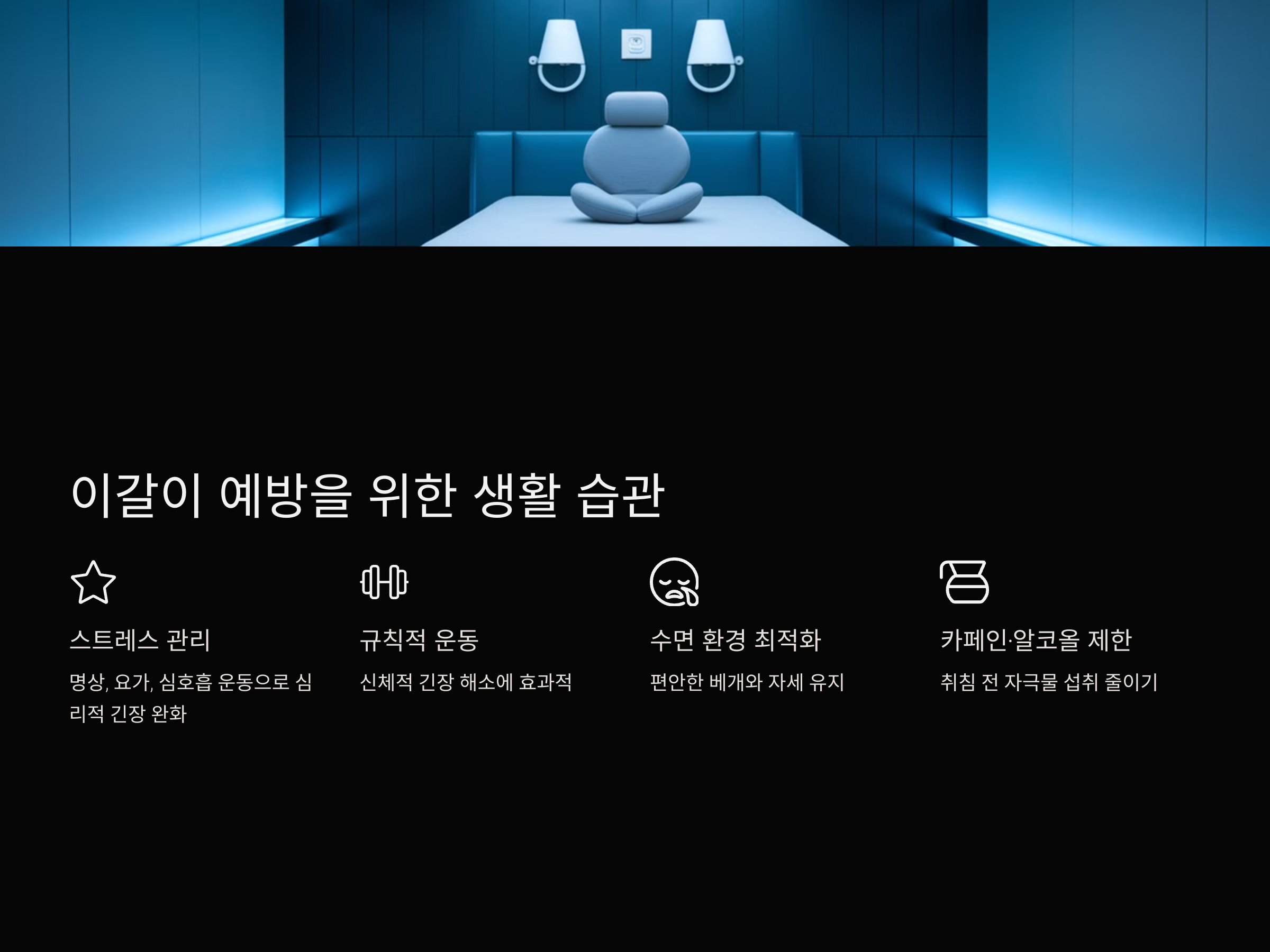 또한, 수면 환경을 최적화하는 것도 중요합니다. 지나치게 딱딱한 베개나 불편한 자세는 턱 근육에 부담을 줄 수 있으므로 편안한 수면 자세를 유지하는 것이 좋습니다. 카페인과 알코올 섭취를 줄이고, 취침 전 이완 요법을 실천하는 것도 이갈이 예방에 도움이 됩니다.