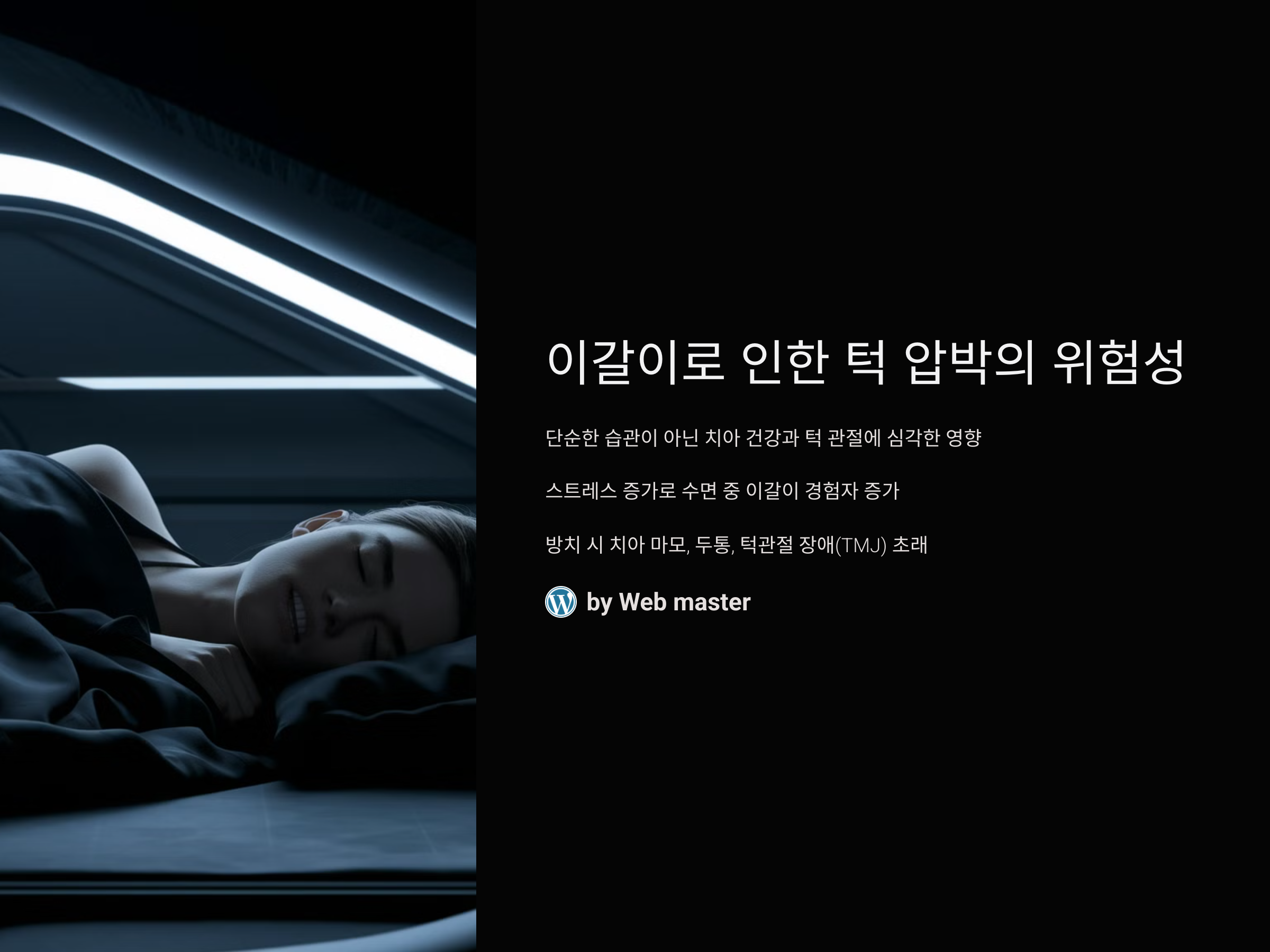 수면 중 이갈이로 인한 턱 압박은 단순한 불편함을 넘어 건강에 심각한 영향을 미칠 수 있습니다. 가장 흔한 문제는 턱관절 장애(TMJ)로, 턱이 틀어지거나 관절이 손상될 위험이 있습니다. 또한, 지속적인 압박은 치아의 마모를 가속화시키며, 심한 경우 치아가 깨질 수도 있습니다.