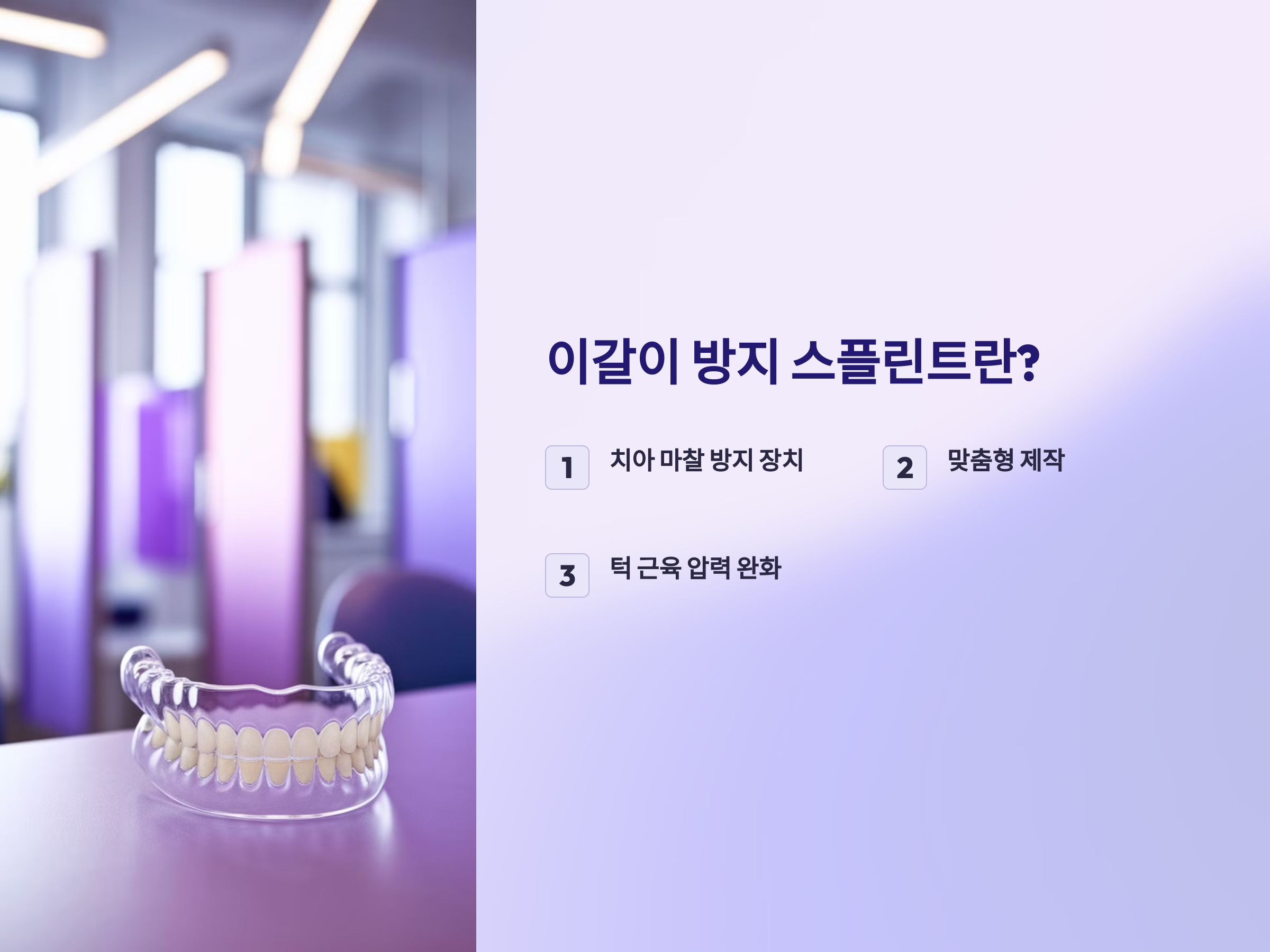 이갈이 방지 스플린트는 치아가 서로 마찰을 일으키지 않도록 설계된 장치입니다. 주로 수면 중에 착용하며, 이갈이를 방지하여 치아 마모를 예방하고, 턱의 근육에 가해지는 압력을 완화해 줍니다. 이 스플린트는 대부분 투명한 플라스틱으로 제작되며, 사용자의 치아 모양에 맞게 맞춤형으로 제작됩니다.