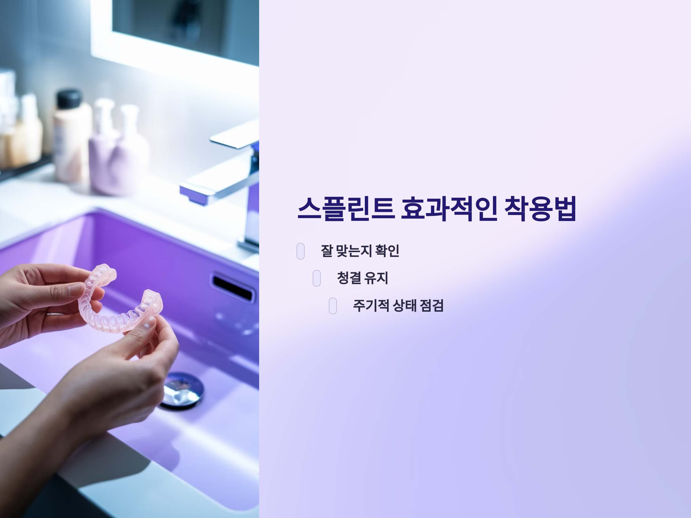 이갈이 방지 스플린트를 착용하는 방법은 매우 간단하지만, 몇 가지 주의할 점이 있습니다. 첫째, 스플린트가 입에 잘 맞는지 확인해야 합니다. 만약 스플린트가 불편하다면, 치과에 다시 가서 조정을 받아야 합니다. 둘째, 착용 시 불편한 점이 없도록 하루에 몇 번씩 착용 상태를 점검하고, 스플린트에 이물질이 끼지 않도록 청결을 유지해야 합니다.