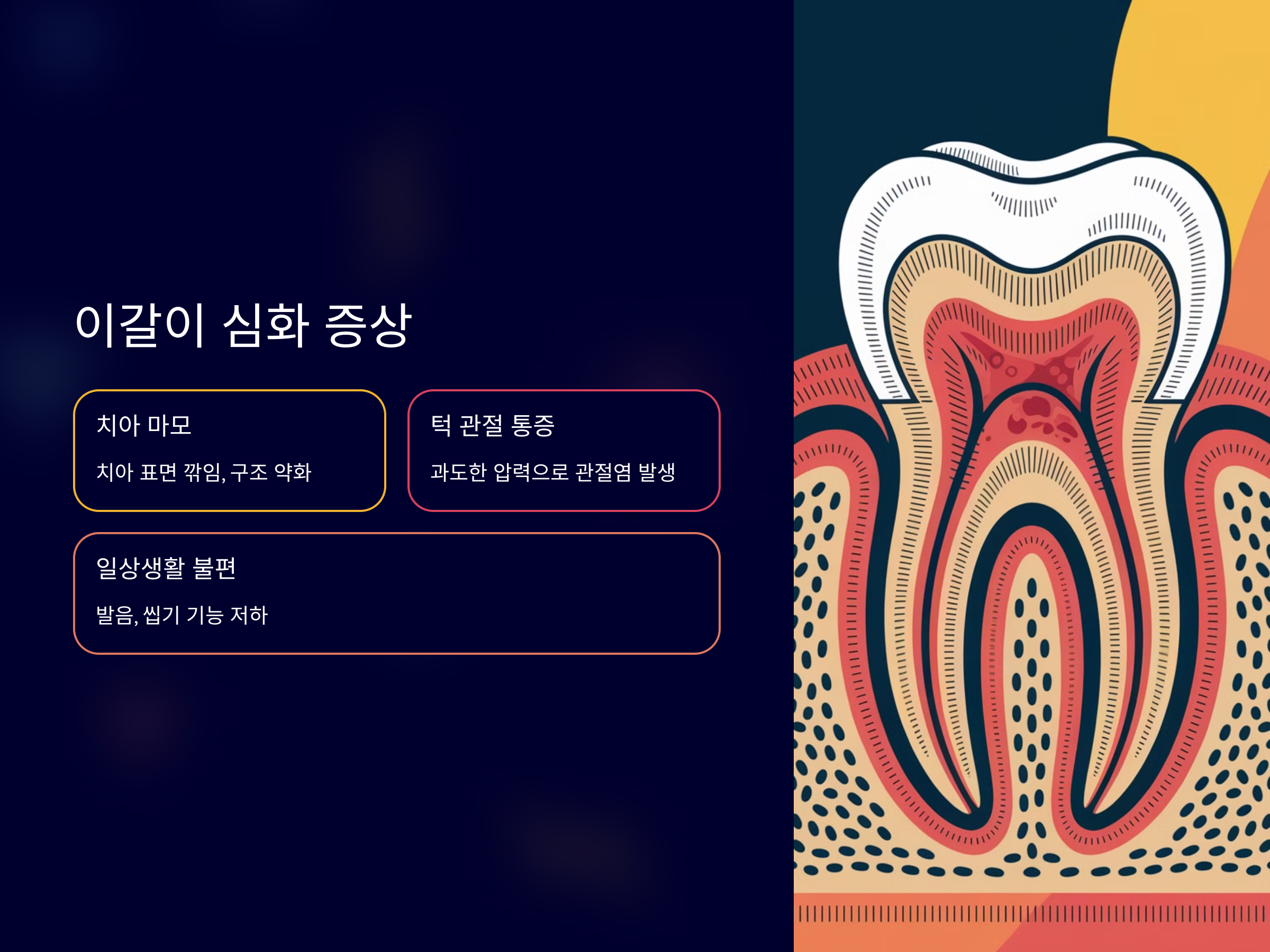 이글을 통해 이갈이의 심화 증상과 그로 인한 턱 관절 통증, 치아 마모의 해결 방법을 알아보세요. 당신도 이 문제를 해결할 수 있습니다!