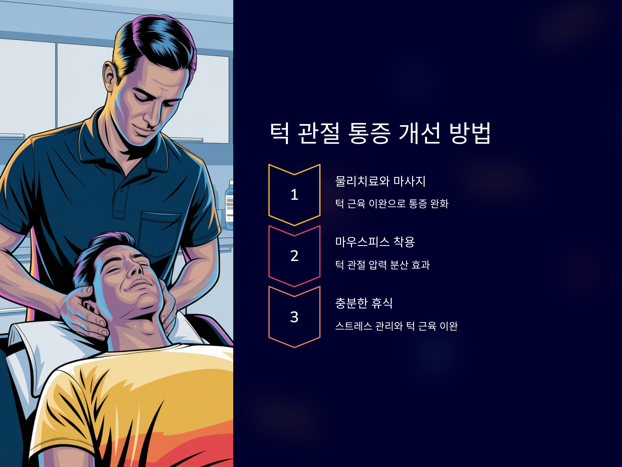 턱 관절 통증을 개선하려면 몇 가지 방법을 시도할 수 있습니다. 첫째, 물리치료나 마사지로 턱 근육을 이완시킬 수 있습니다. 턱 근육을 이완시키는 방법은 턱에 가해지는 압력을 줄여주어 통증을 완화시킬 수 있습니다.
