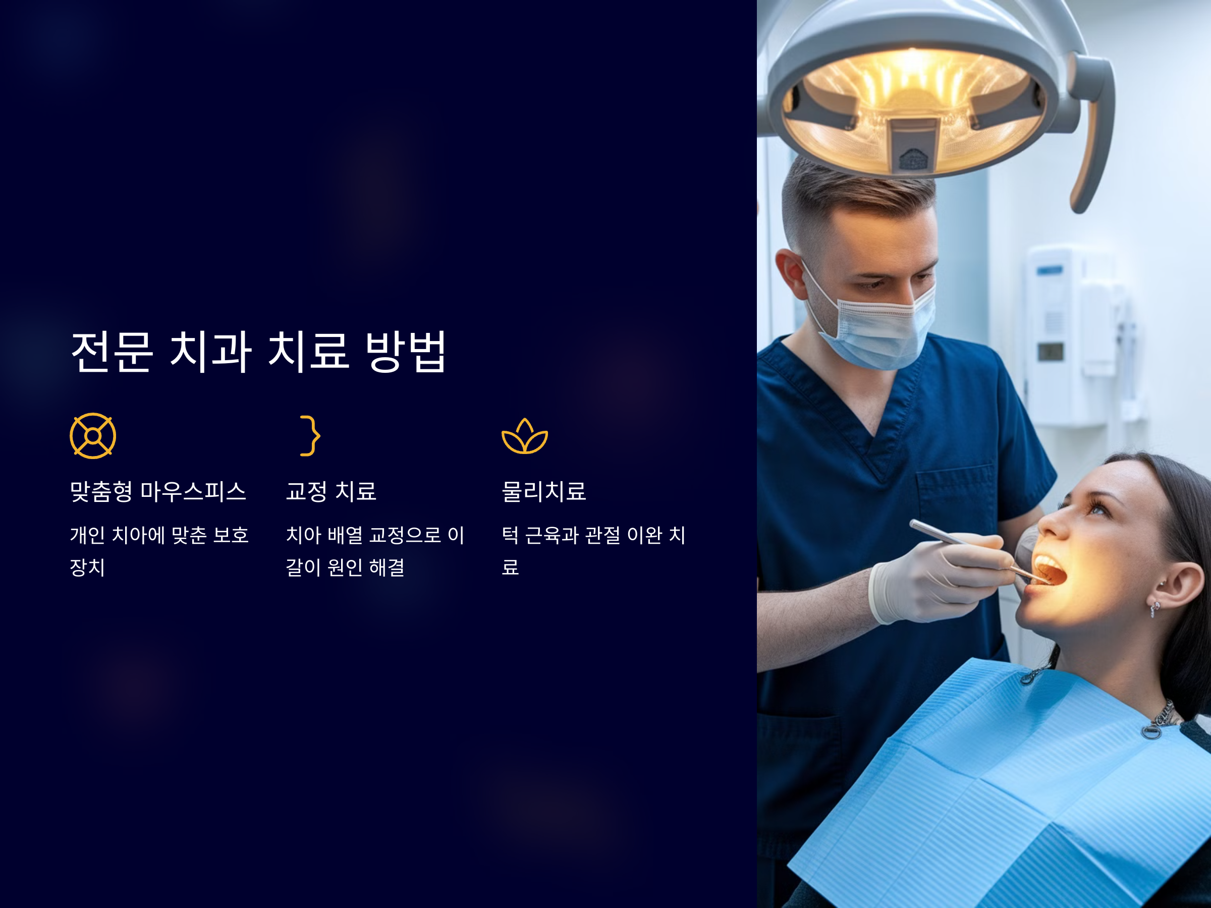 이갈이가 심각한 경우에는 치과적 치료가 필요할 수 있습니다. 치료 방법으로는 맞춤형 마우스피스, 교정 치료, 물리치료 등이 있습니다. 맞춤형 마우스피스는 치과에서 제공하며, 이를 통해 이갈이로 인한 치아 마모를 예방하고, 턱 관절에 가해지는 압력을 분산시킬 수 있습니다.