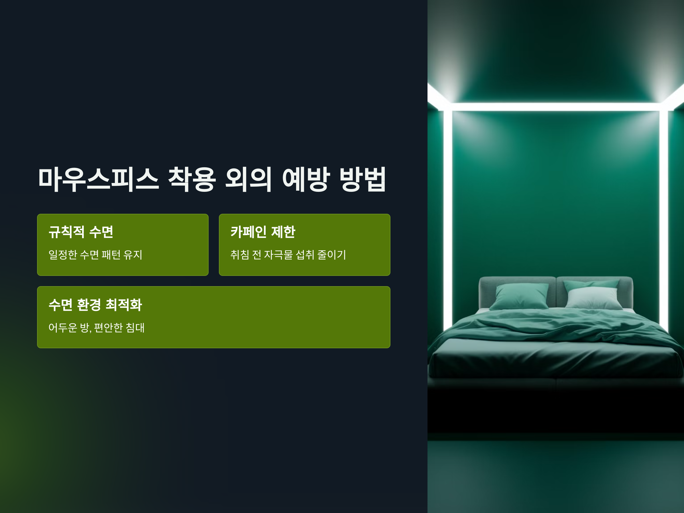 마우스피스를 착용하는 것 외에도, 이갈이를 예방할 수 있는 몇 가지 방법이 있습니다. 예를 들어, 규칙적인 수면 패턴을 유지하고, 음주나 카페인 섭취를 줄이는 것 등이 효과적인 방법입니다. 카페인이나 알콜은 신경계를 자극하여 이갈이를 유발할 수 있으므로, 특히 취침 전에 과도한 음료 섭취를 피하는 것이 중요합니다.