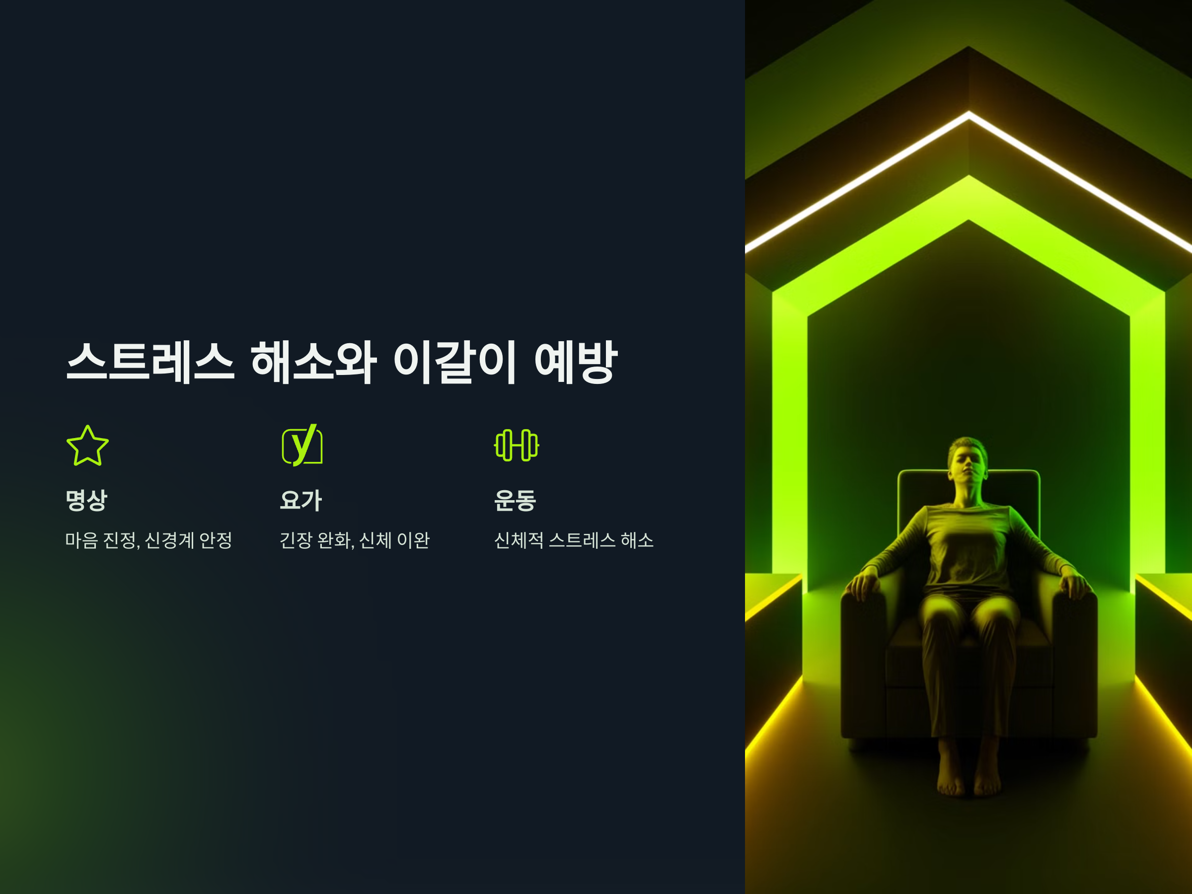 특히, 깊은 호흡을 통해 신경계를 안정시키고, 마음을 진정시키는 방법은 이갈이 예방에 큰 효과가 있습니다. 또한, 정기적인 운동은 신체적인 스트레스를 해소할 뿐만 아니라, 전반적인 건강을 증진시켜 이갈이 문제를 간접적으로 예방하는 데 도움이 됩니다. 하루에 몇 분씩 짧은 명상이나 스트레칭을 하는 것만으로도 큰 변화를 경험할 수 있습니다.