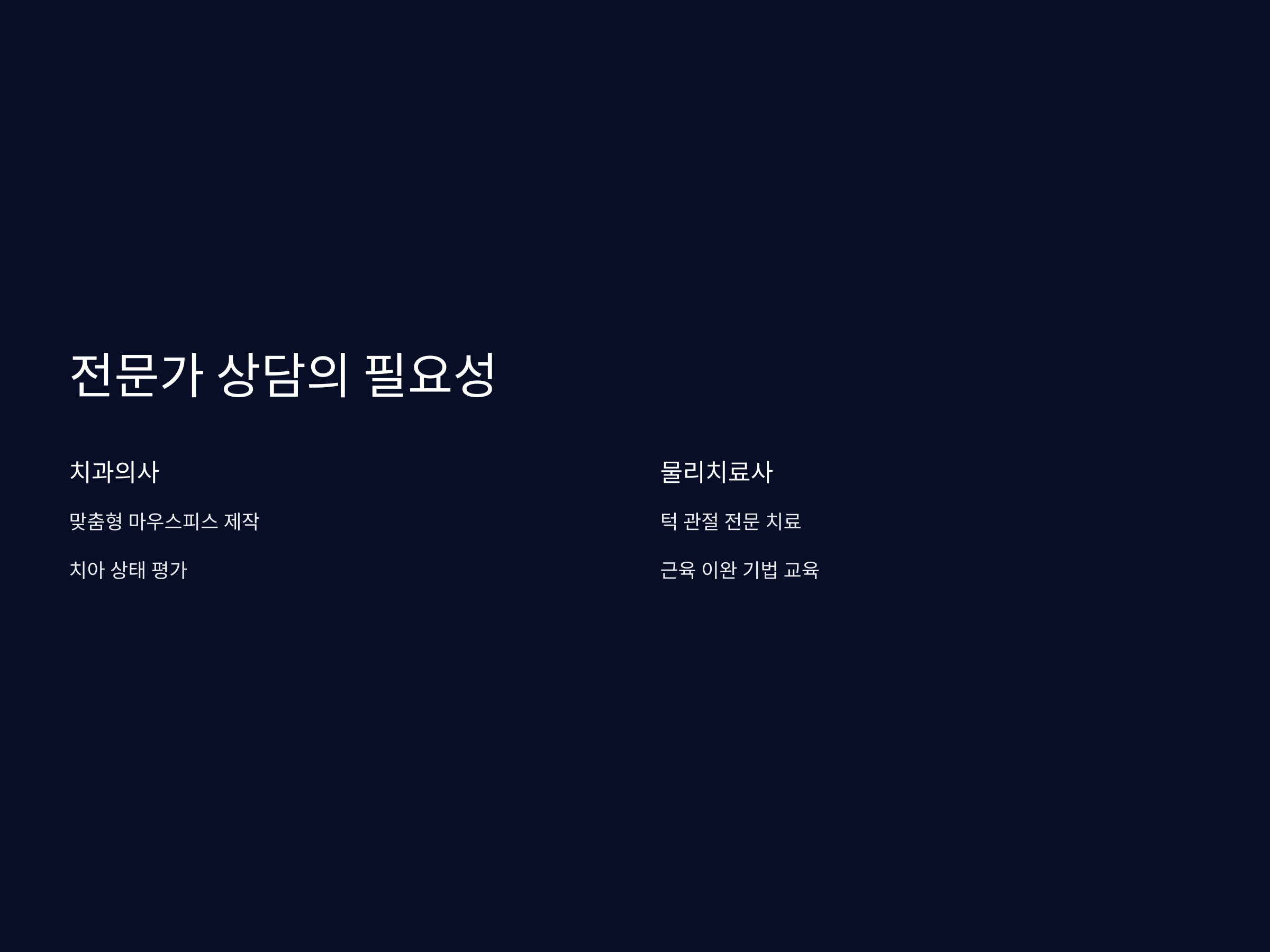 마우스피스 착용과 스트레칭으로도 충분한 효과를 보지 못한다면 전문가의 상담을 받는 것이 좋습니다. 전문가의 도움을 받으면 맞춤형 치료를 받을 수 있습니다.